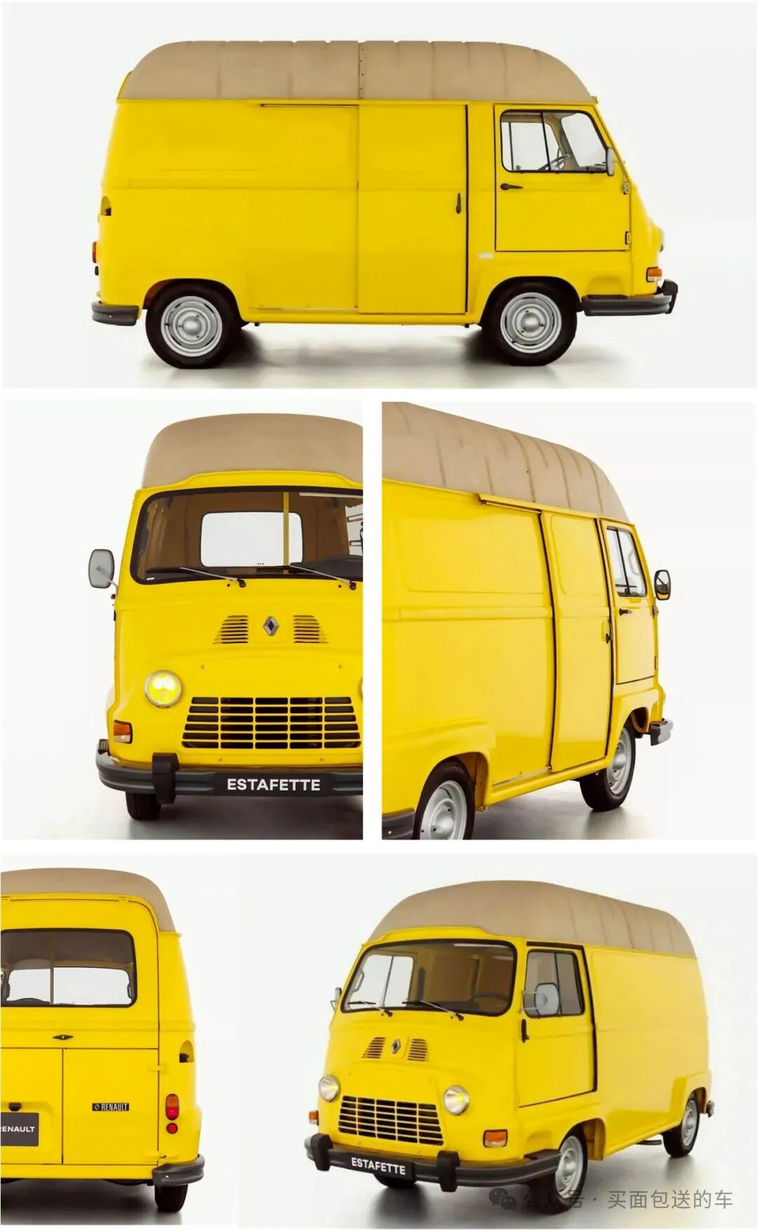 通过对Estafette车身和车门的巧妙设计,雷诺在这个平台上总共推出5款细分车型: Zone Bleue 款(方便在市内狭小的空间停车)、最大载重600公斤的小货车、加高的厢式货车、篷布式皮卡车以及前后三排的9座微型小巴!