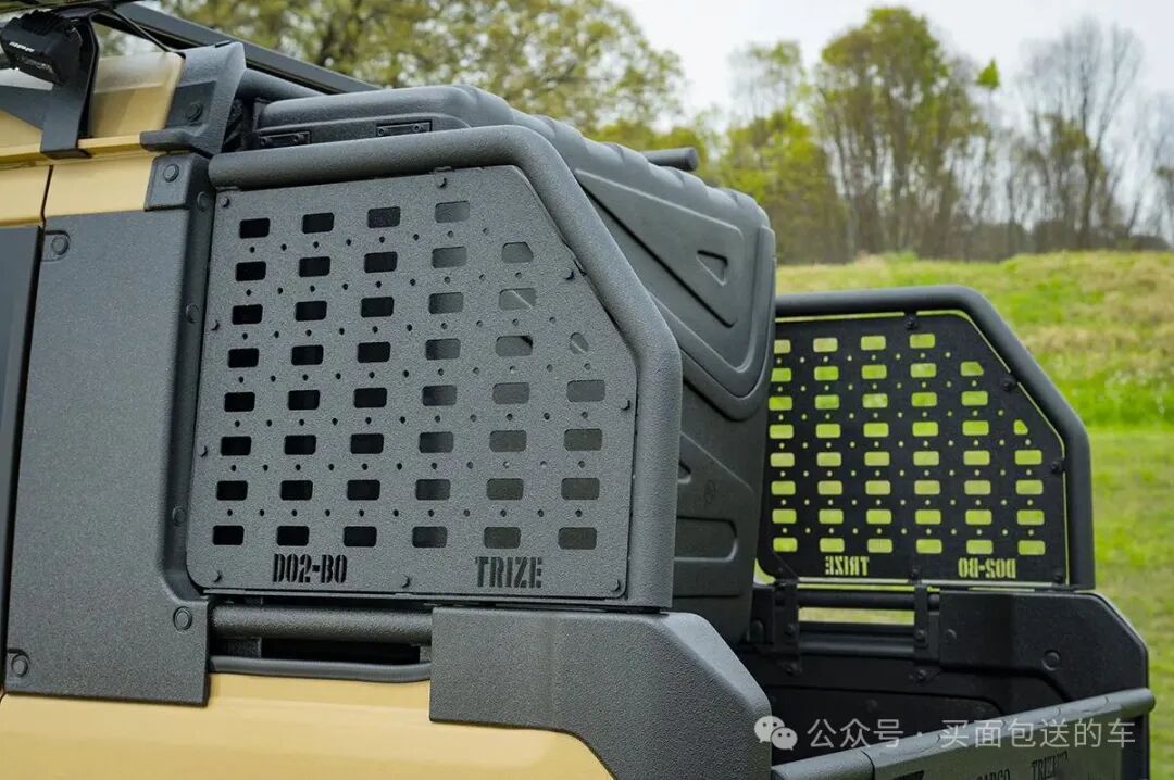 但东汽车株式会社重新制作了侧边护网板,支持MOLLE的尼龙带安装方式和M6的螺栓安装,并对货箱内侧整体进行了喷塑,硕大的尼龙设备收纳箱来自于北美越野品牌YAKIMA标准配件产品(完)。