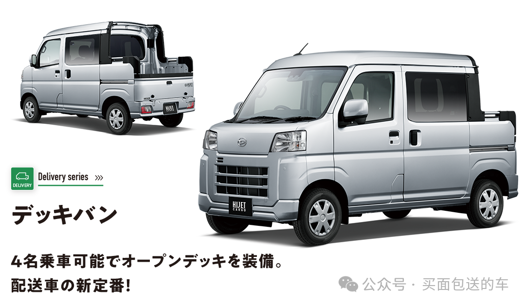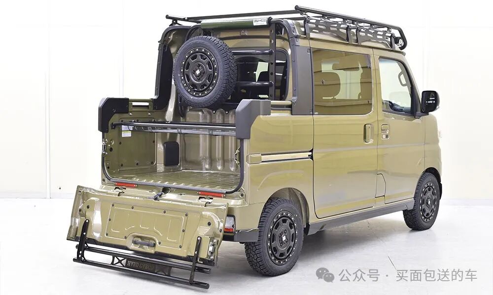 大发汽车在HIJET平台上开发出最有特色的款型是HIJET DECK VAN,在第二排后面的空间制作出开放式货箱,这就相当于面包车+皮卡的混合款式,之前官方也在2023年的车展上推出了针对露营的改装作品,车尾的开发是货箱作为了“户外移动浴缸”使用。
