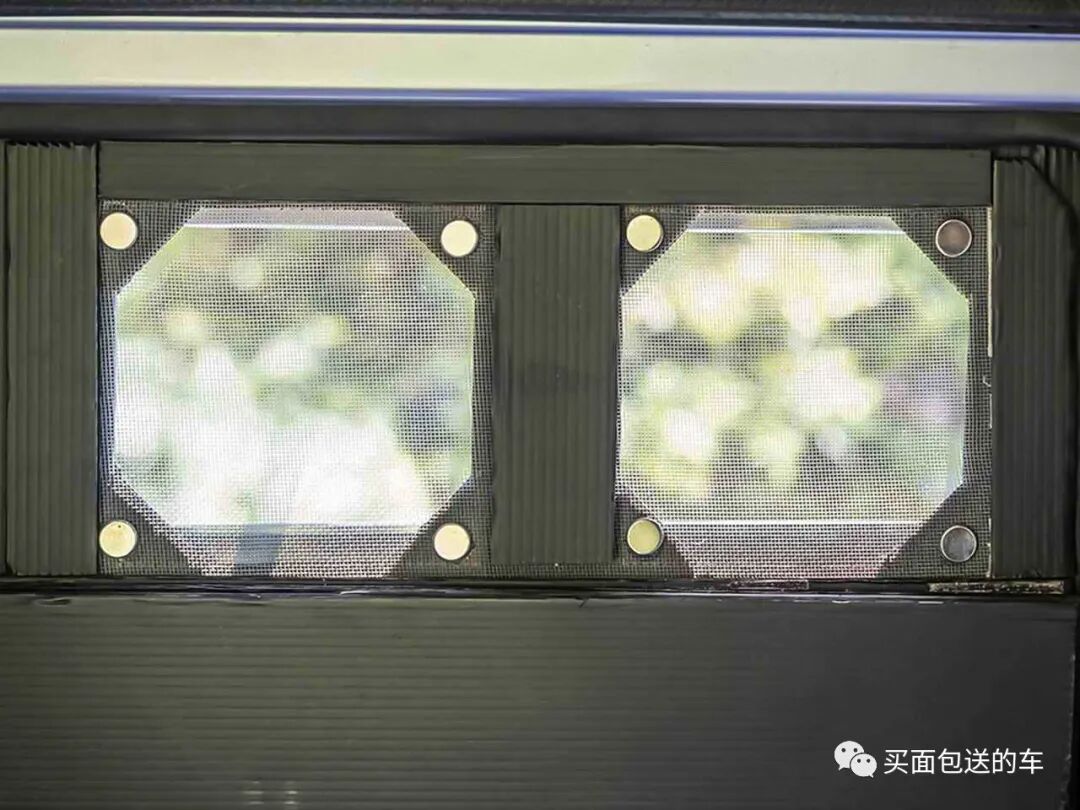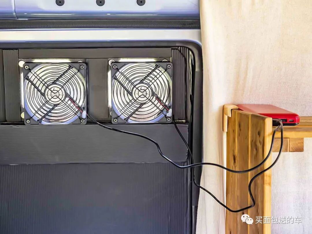在侧滑门玻璃上用热熔胶固定的吹塑板,用磁铁安装并用充电宝驱动的通风扇。