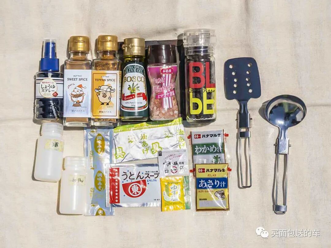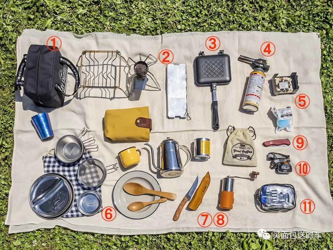 (1)调味袋。(2)SOTO炉头和挡风玻璃套件。(3)RidgeMonkey Connect折叠三明治煎锅。(4)喷火燃烧器。(5) 固体酒精。(6)餐具和餐具。(7)厨刀(8)咖啡磨。(9)从热爱户外的父亲那里继承下来的多功能刀。(10)头灯 。(11) 卫生用品。