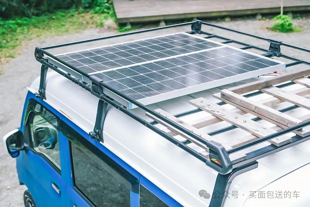 两块太阳能电池板并联连接,为车辆内部的移动电源供电。