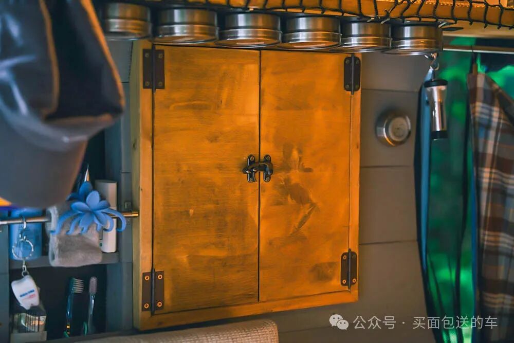 后门板上改装了内部开启的门锁拉扣,以便在车内自由打开和关闭。利用“展示存储”来挂起和装饰