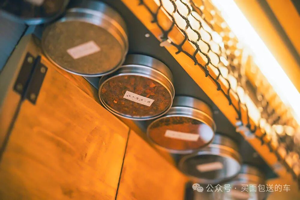 由于车身采用金属材质,各种凉茶的茶叶在充分利用磁铁和挂钩的“空中储物”中精美展示