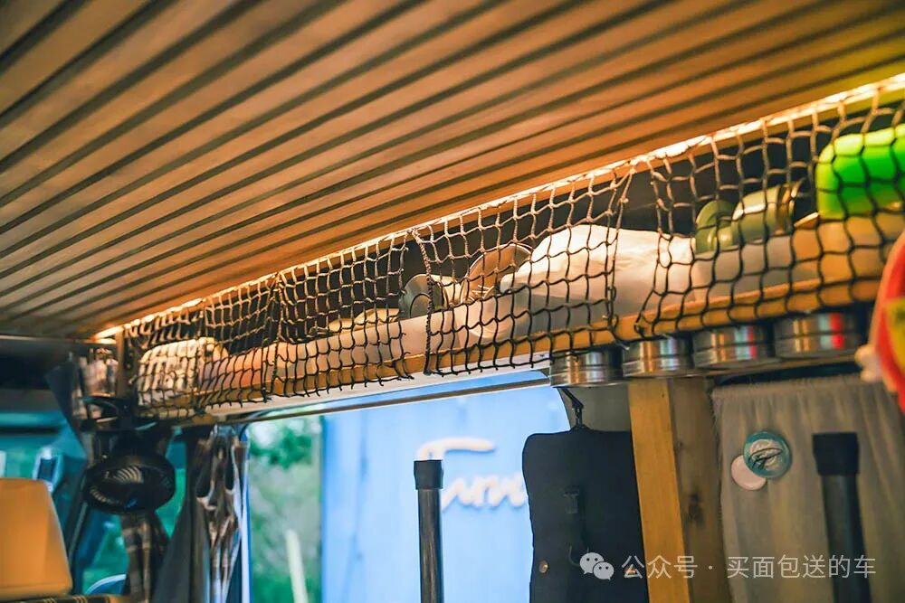 Maho:努力让车内储物空间发挥到极致。 车顶圆润的内角墙壁,如果加上架子,会产生死角,让车内看起来小,所以我决定把许多杂物它放在天花板上。