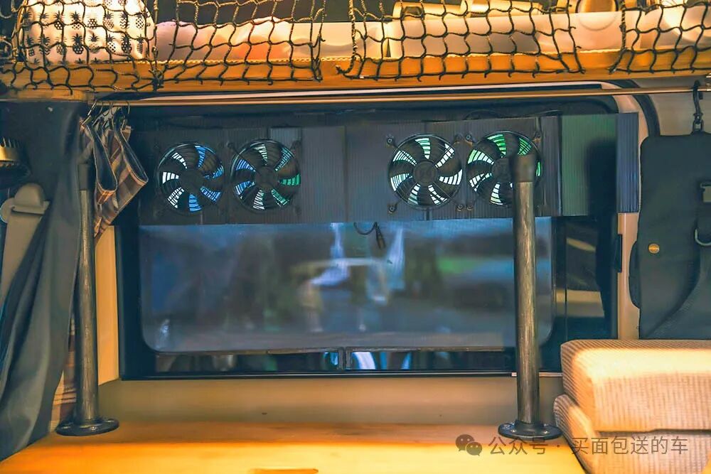 Un-chan:这也是我们做饭的一个厨房柜台。我们还在侧门窗户上配备了换气扇,这样气味就不会被困住。 有 4 个USB供电驱动冷却风扇。当天气炎热时,这也是将暖空气排出车外的好方法。
