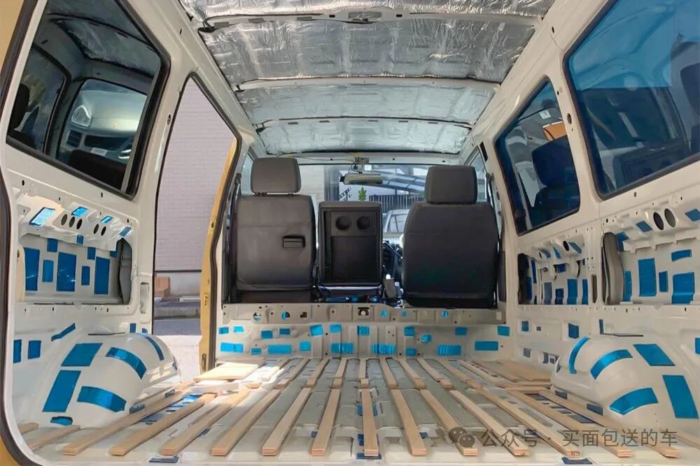 为了车中泊的需要,原车的内饰板拆除后加入了隔音胶和木板条。
