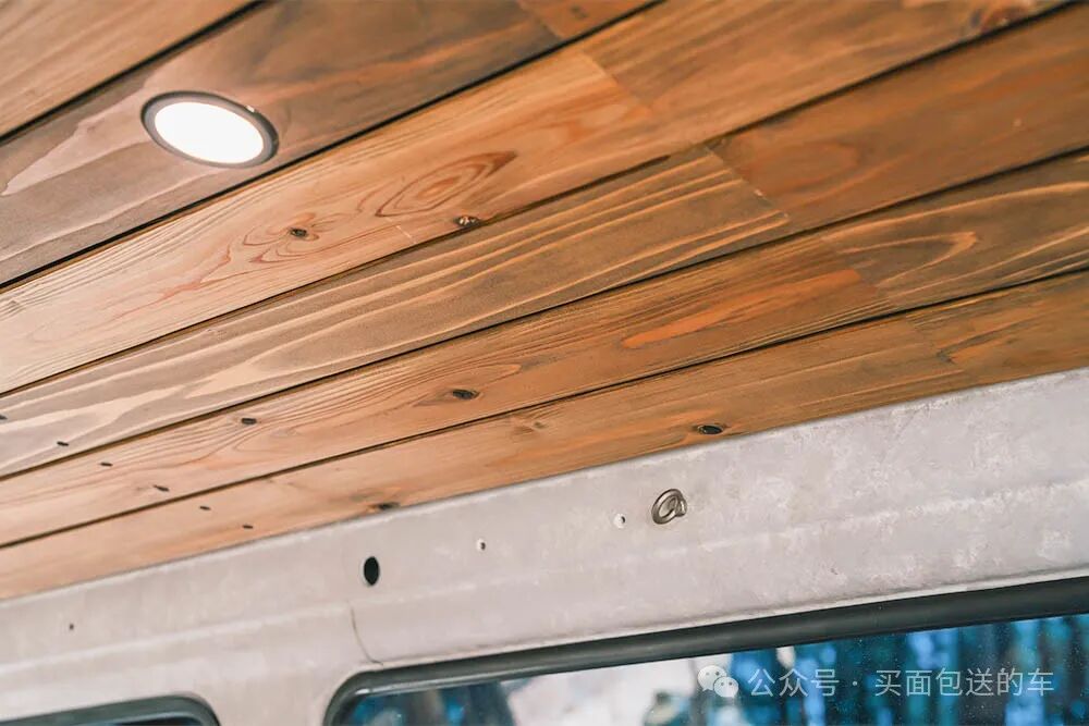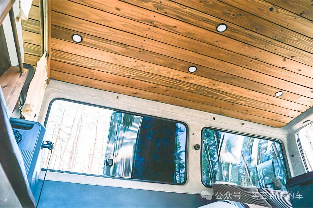 条纹床单和木板制作的天花板与地板都有效放大了车内的空间视觉体验。