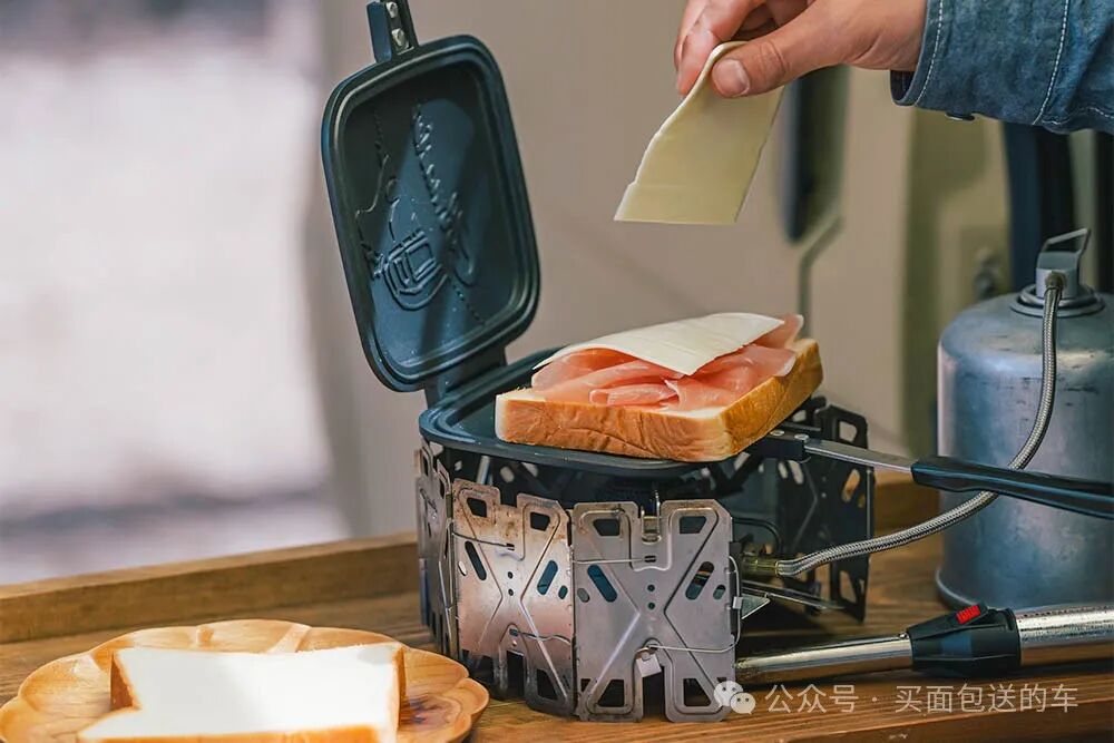 在户外加热预制的食材能快速制作早餐,比如培根和芝士的三明治。