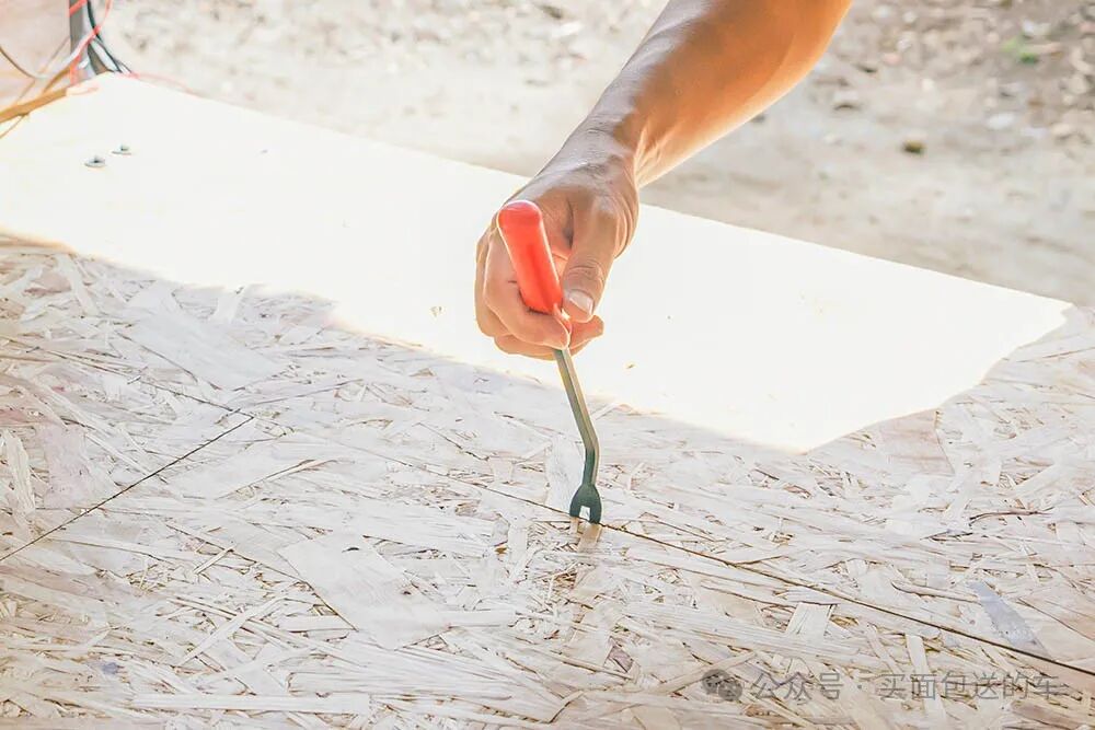 地板中间预留作为发动机舱的维护舱口位置。要知道在岛国:实木指接板很昂贵,这种木屑板是廉价而实用的选择。
