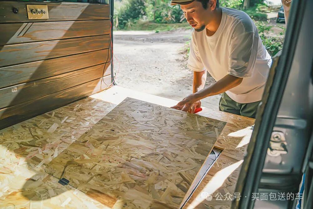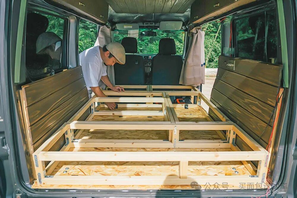 用雪松条制作框架,将后排空间改为完全平直的结构,要考虑到自己的露营装备尺寸,这个设计制作过程如同是玩俄罗斯方块。