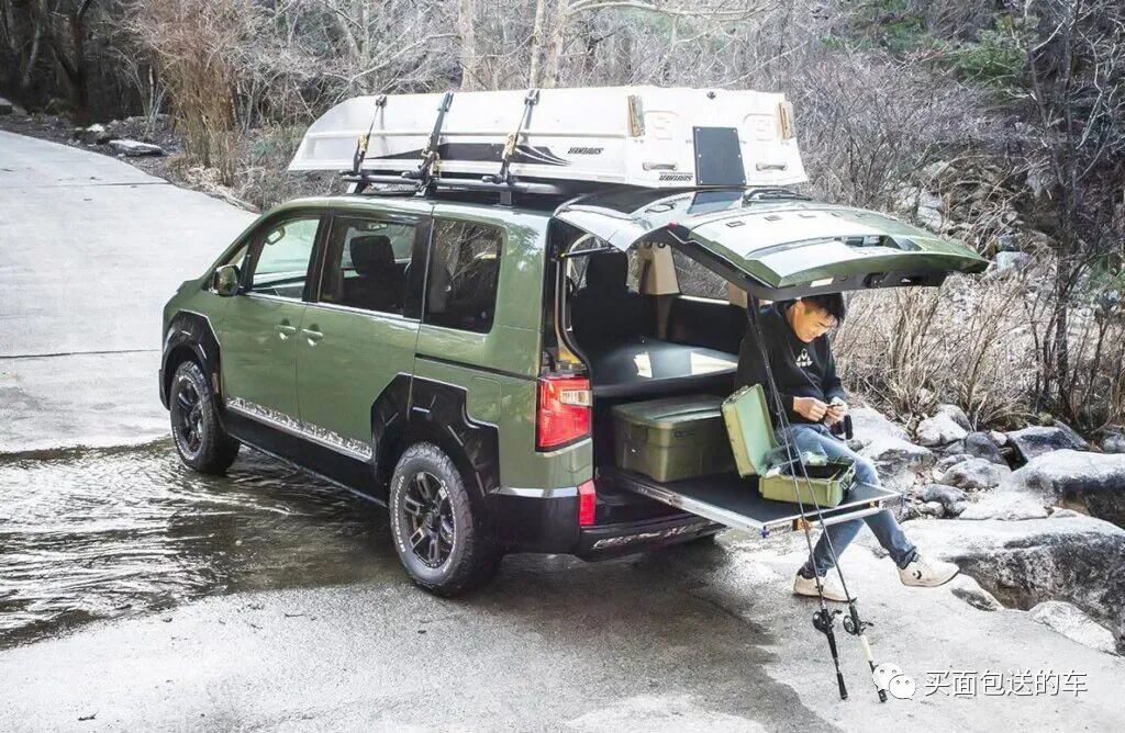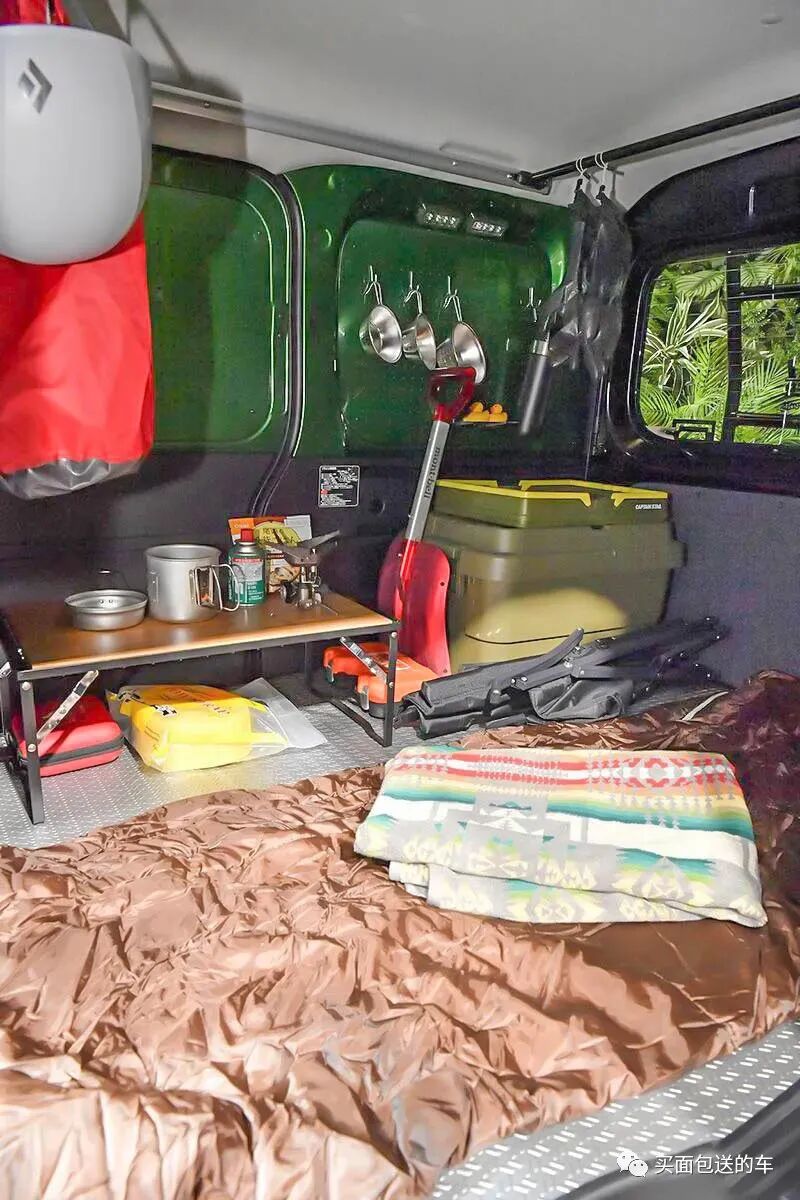车内第二排和后备箱之间做了折叠连通,并添加了救援与露营设备作为户外床车使用。