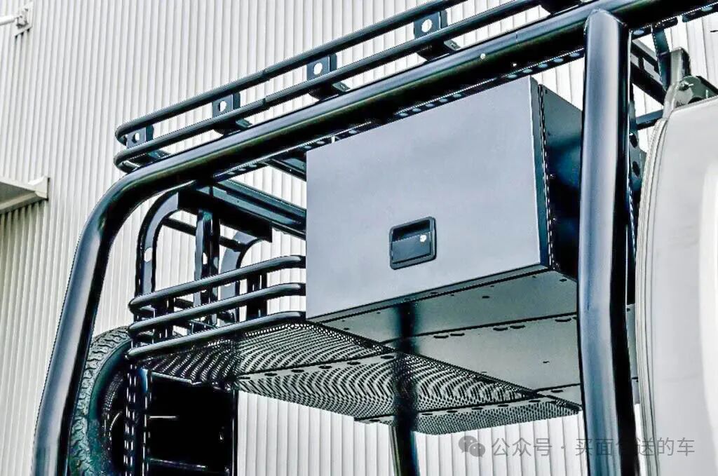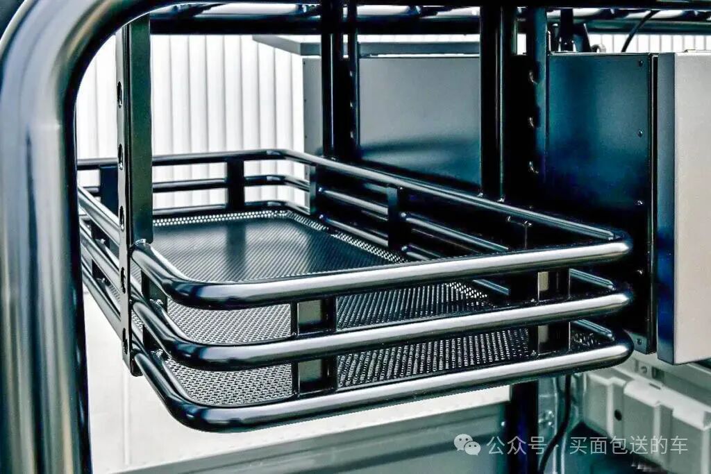 荷台上方被分隔为双层置物平台,独立的金属网兜和三防设备箱。