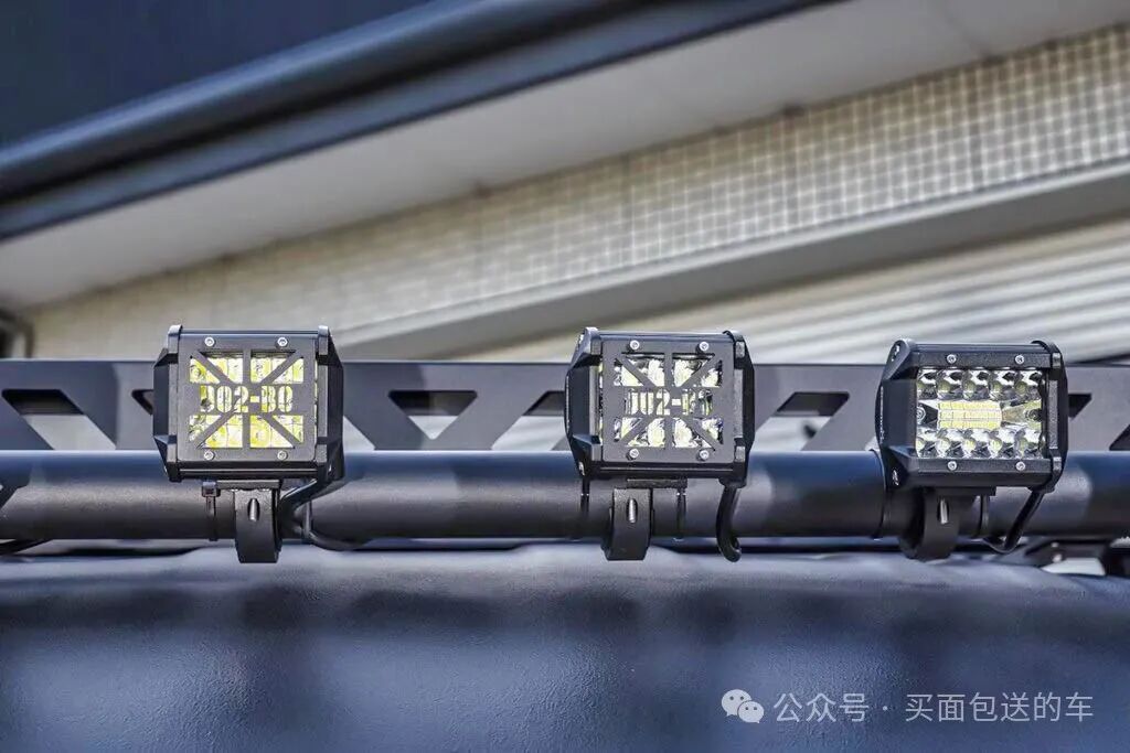通过镂空花纹与喷塑工艺制作的车顶行李架与拉力灯,在户外作为营地照明光。