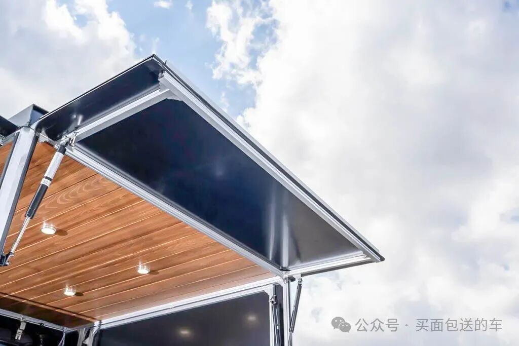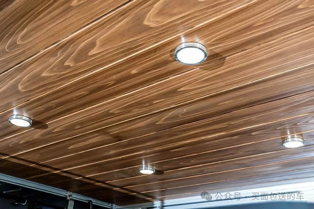相比往期的作品,天花板上保留了木纹装饰板和LED照面灯,这是最大限度利用货箱顶部空间的设计!