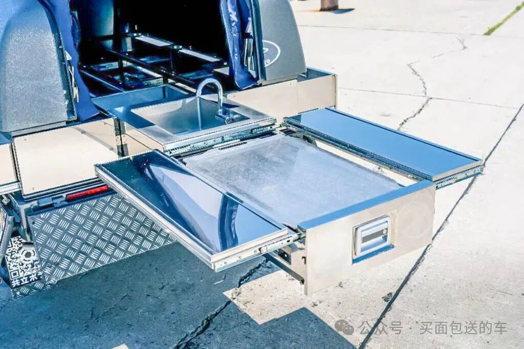 尾箱展开后的上下水水池和烧烤支架,GRASSHOPPER系列将于下半年实现产品化并推向市场(完)。