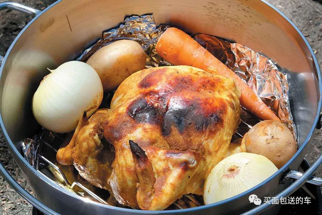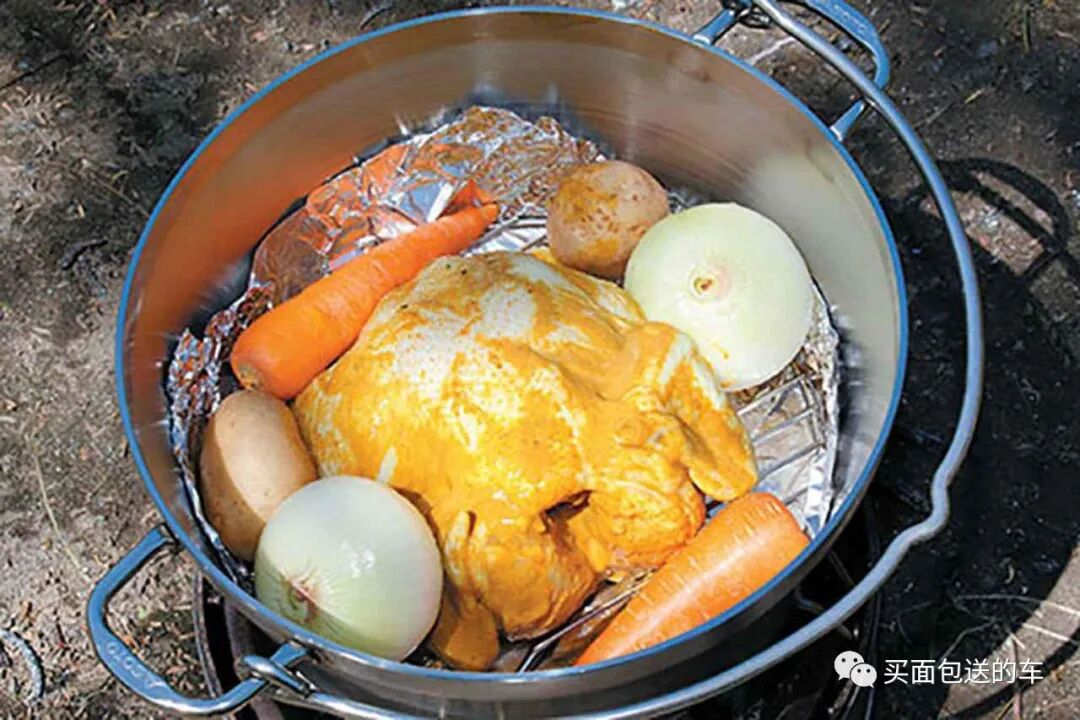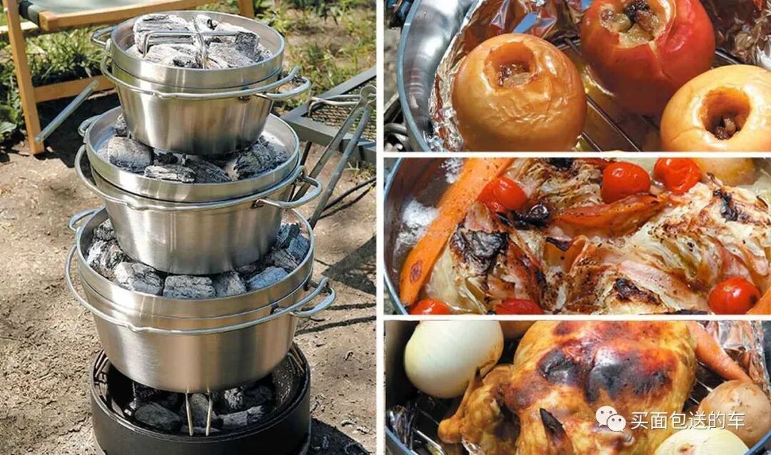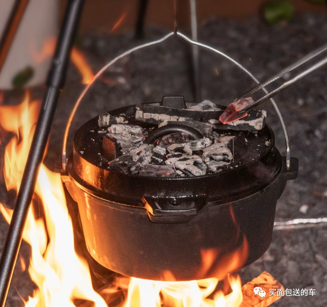 Dutch Oven荷兰烤锅是美国西部拓荒时代兴起的户外厨具,通常跟随大篷车一起进行长途旅行,锅体和锅盖可以上下同时用炭块加热,锅盖的背面可以作为煎烤盘使用,厚厚的铸铁锅体实现长期保温。