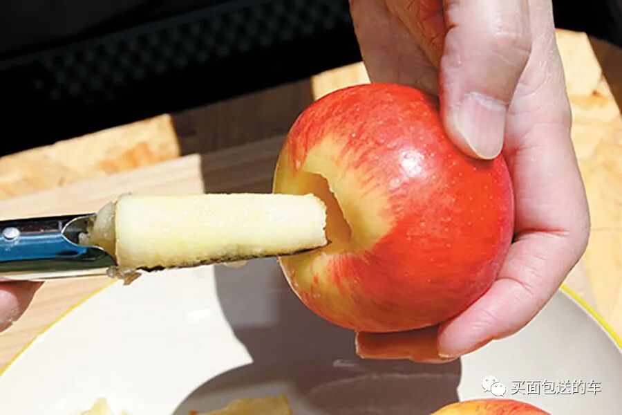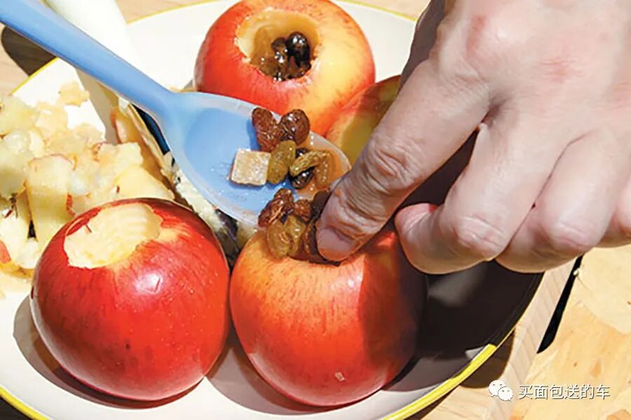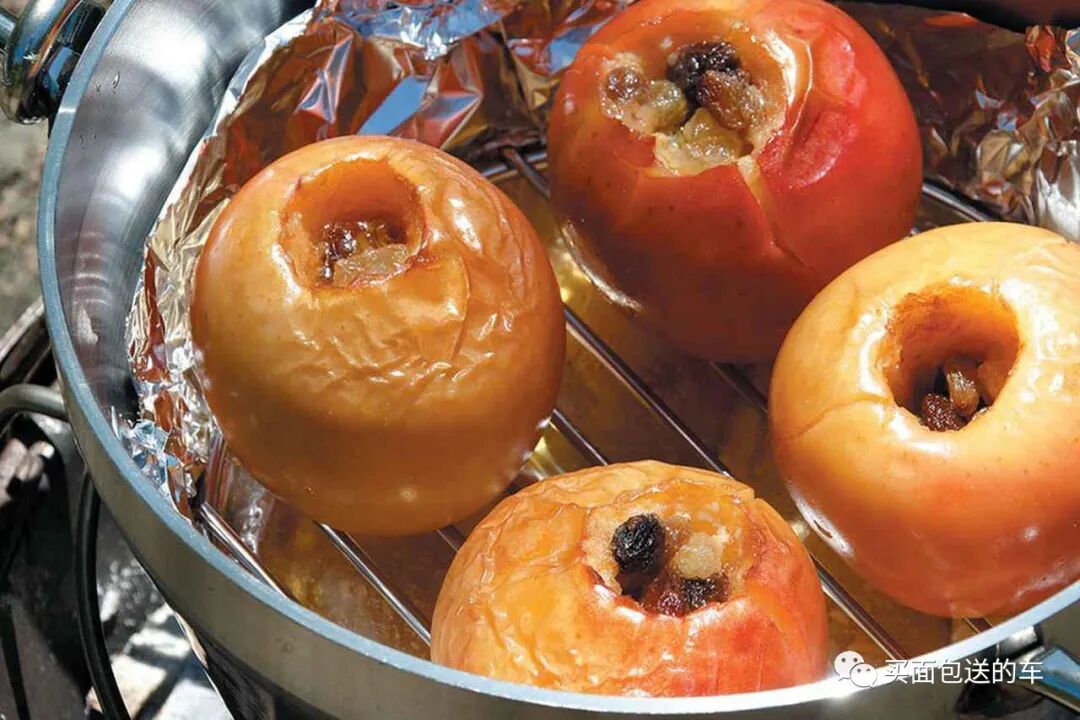 对苹果进行去核处理,将葡萄干,肉桂,蜂蜜混合,埋入苹果内部,在苹果外部涂刷黄油,用荷兰锅上下加热50分钟。