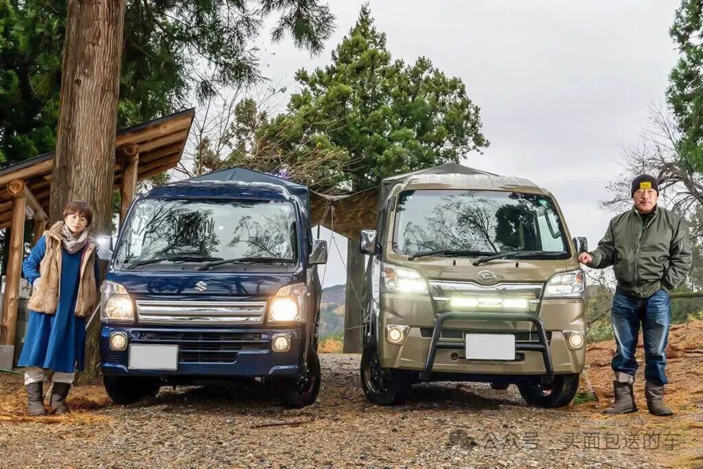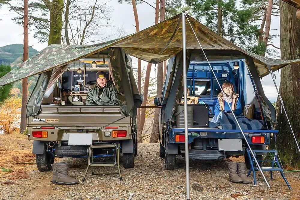 来自于山形县的露营卡车情侣,他们分别选购了铃木CARRY 和大发HIJET作为载具,并向BUG-TRUCK定制了帐篷套件,这让轻卡具备了工具车和露营车的双重属性。