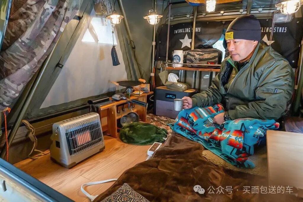 虽然帐篷内部简陋,通过布置也能在冬天实现移动露营。