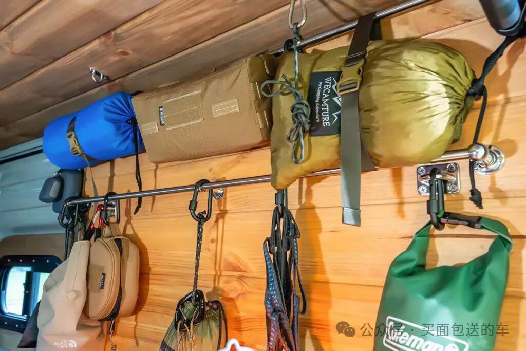 车内的户外装备都是在个人徒步登山时期积累的,通过简单的金属挂件进行安装收纳。