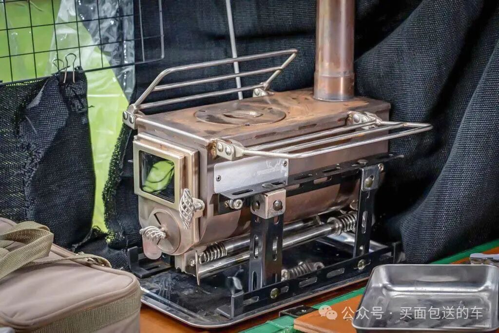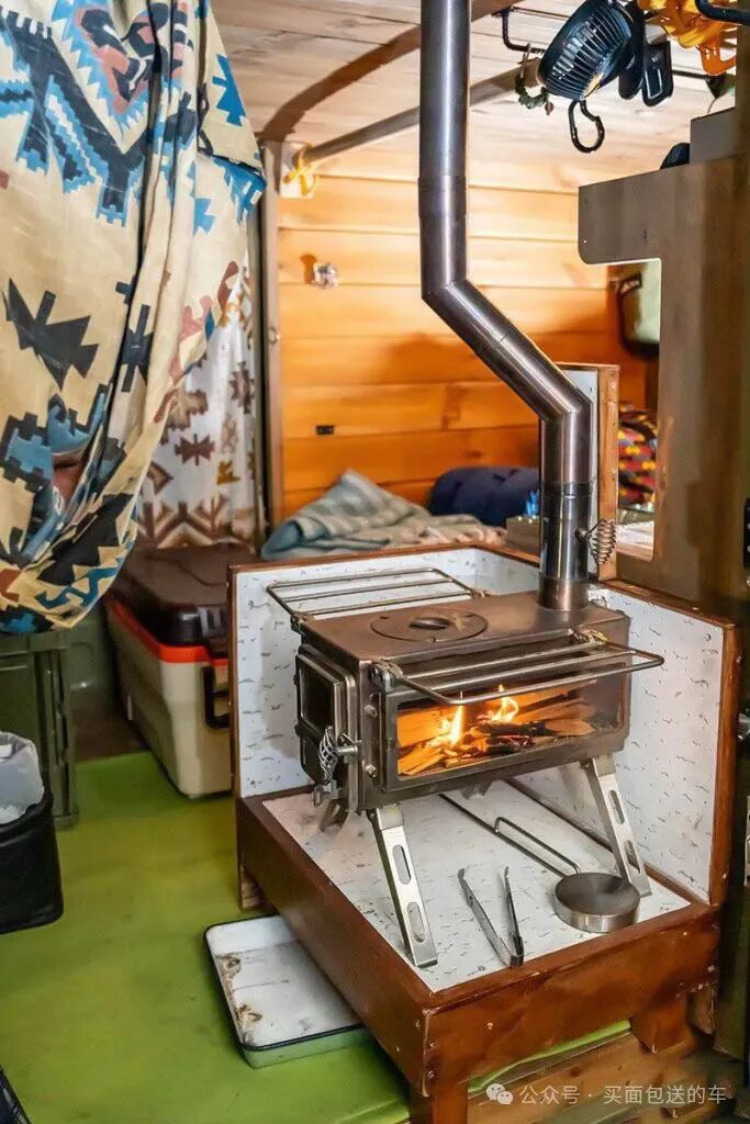 这个独特的烟囱结构能让柴火炉选择方向,让热量投放到车内或门外。