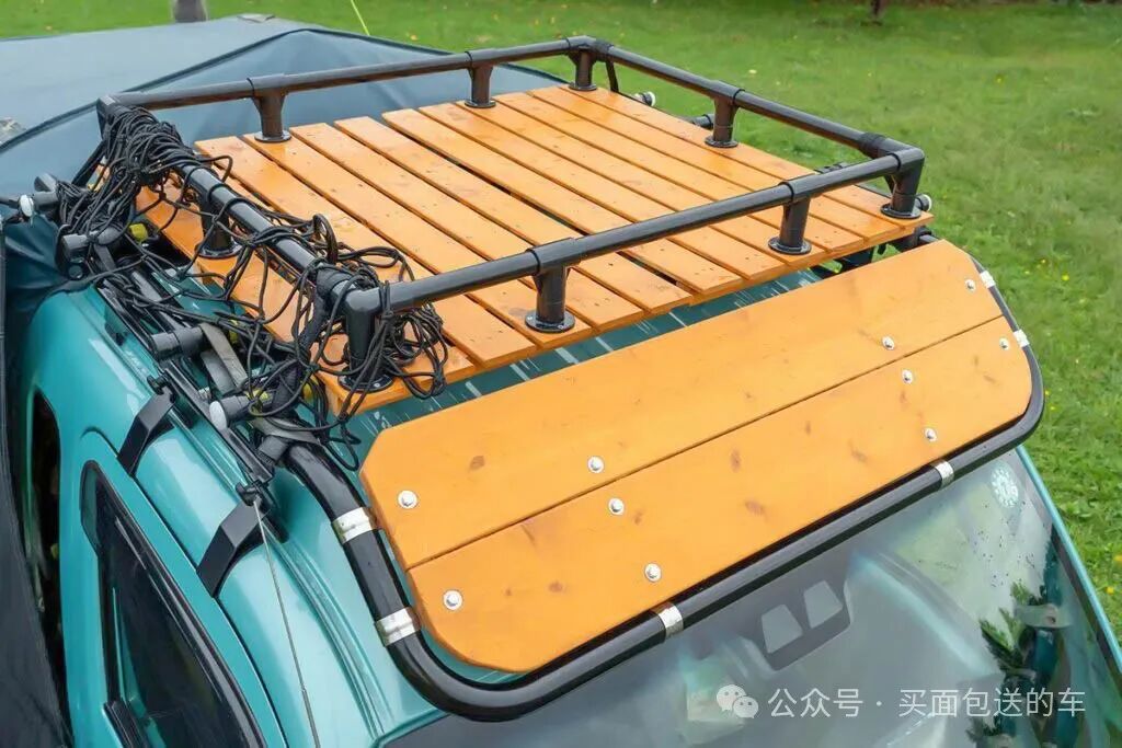 车灯上额外添加的行李架是自己的DIY作品,钢木结构具有田园风格。
