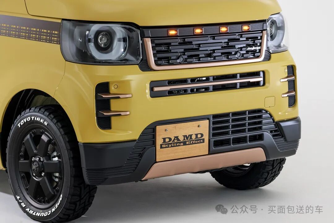 ANGIE套件和RODNEY共用了前保险杠的主体零件,在中网细节上有所不同,保留了本田N BOX原有车灯,毕竟原车圆形导光板的和路虎卫士太神似,而中网上的黄色LED小灯条确实是制造硬派越野车造型点睛之笔。