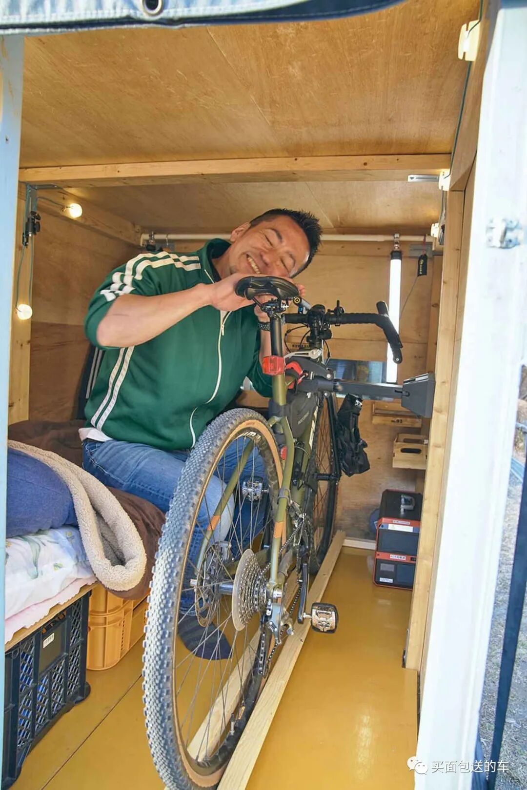 除了床位和基本生活用品,箱内固定的就是公路自行车了,在不开车的时候满足自己短途移动