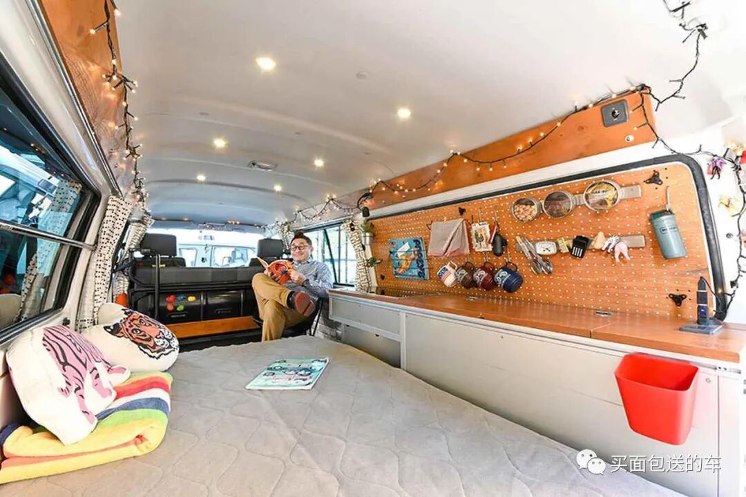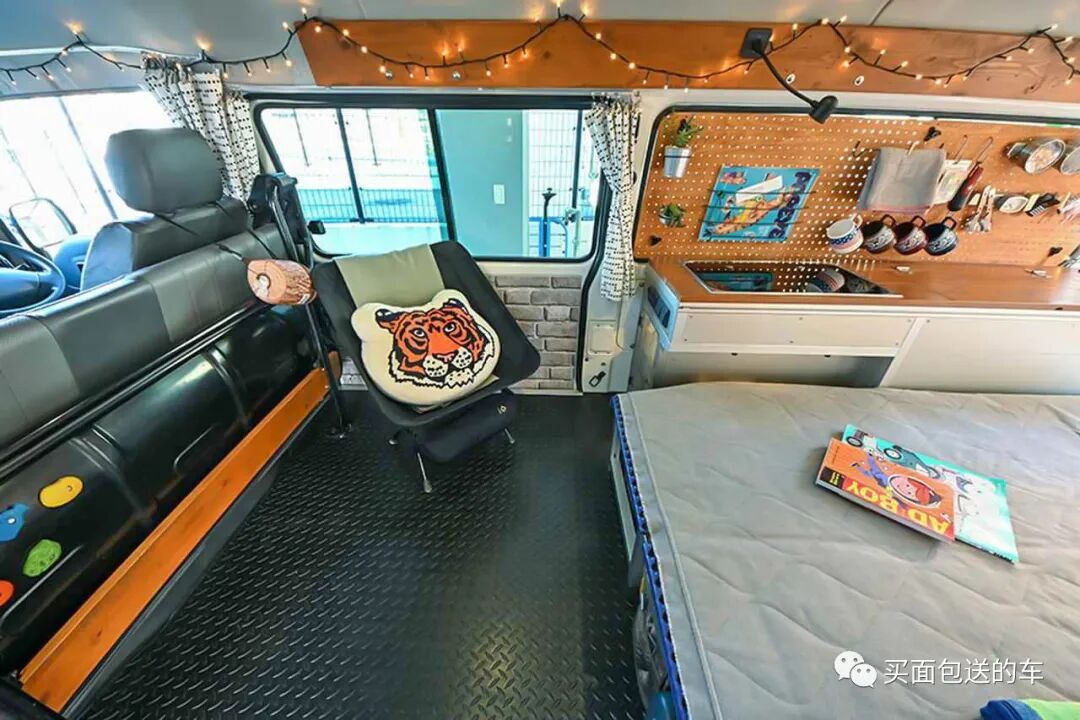 通过组合的家具,车内可以改装为作为客厅或是双人床房的模式,其实这个床铺更多是作为榻榻米来使用的。