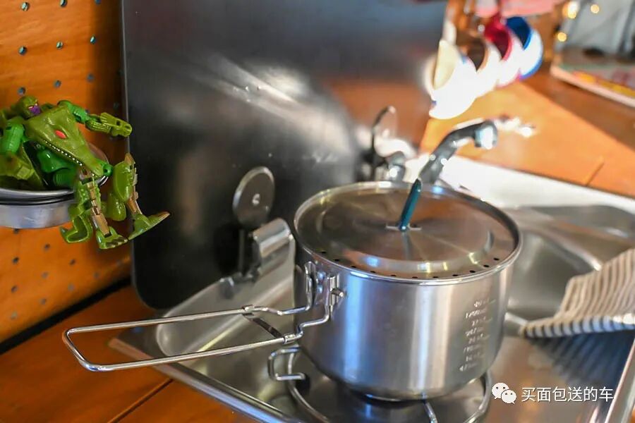 车内一侧制作的工作台,集成了厨房功能,并在墙面上安装了洞洞板,方便挂载生活用品。