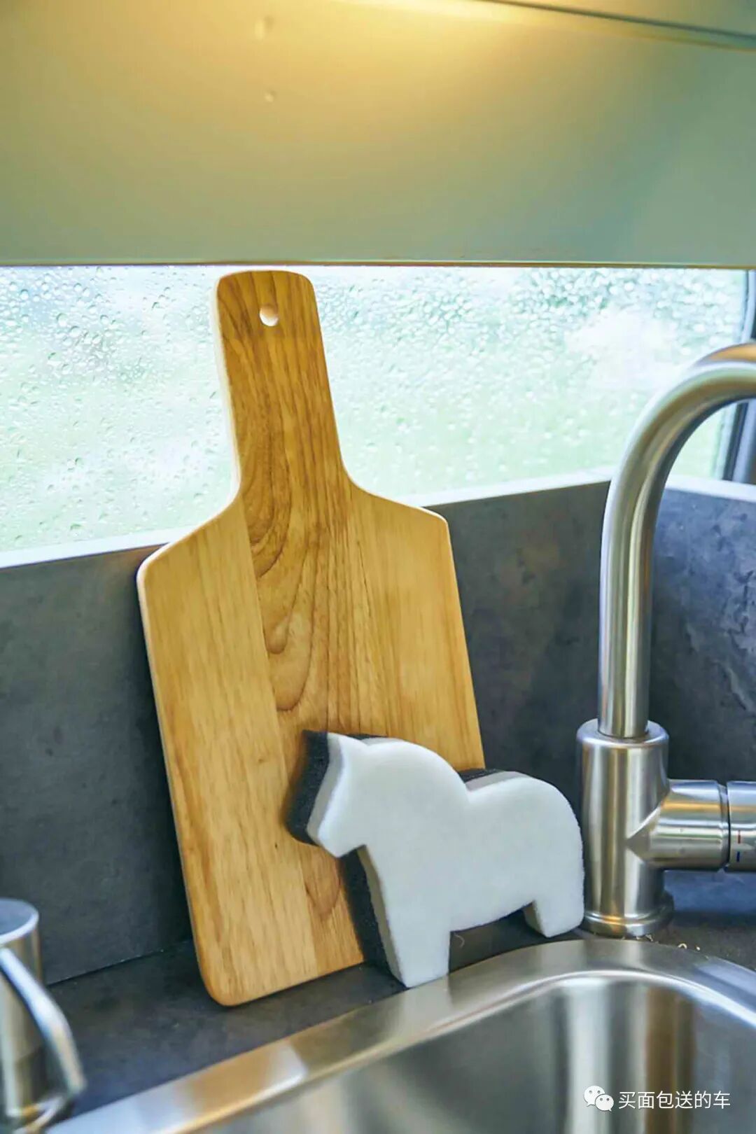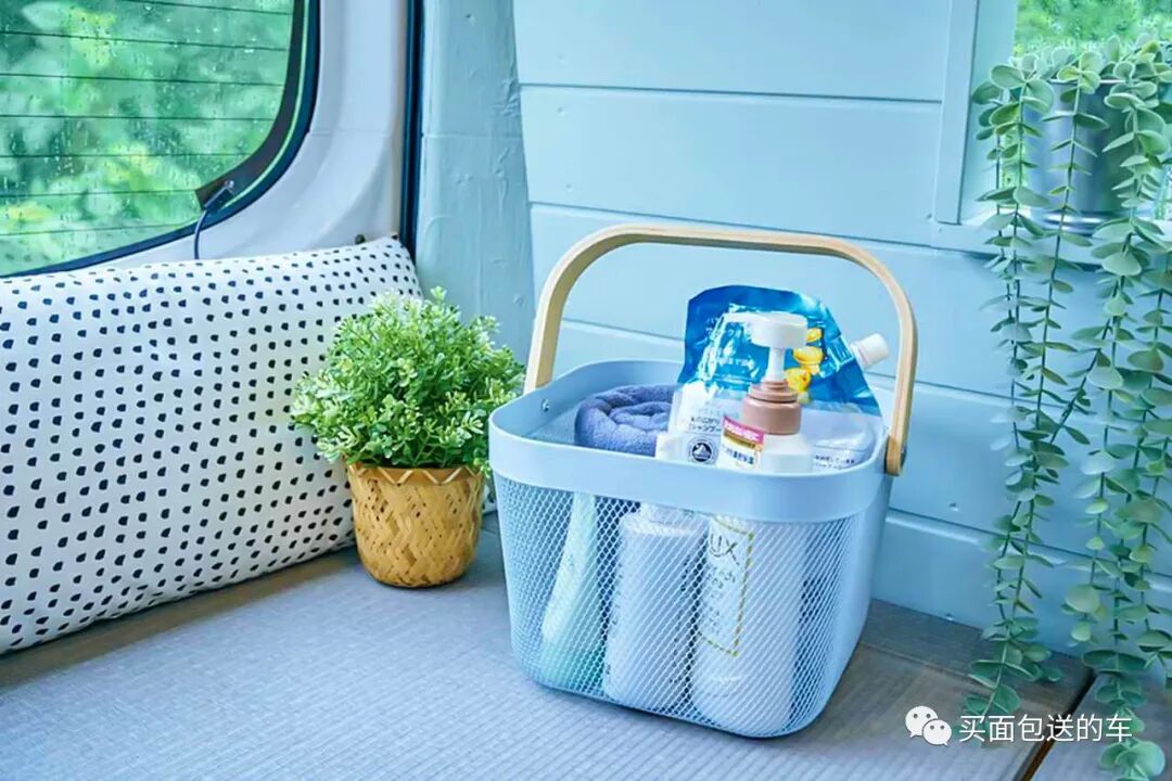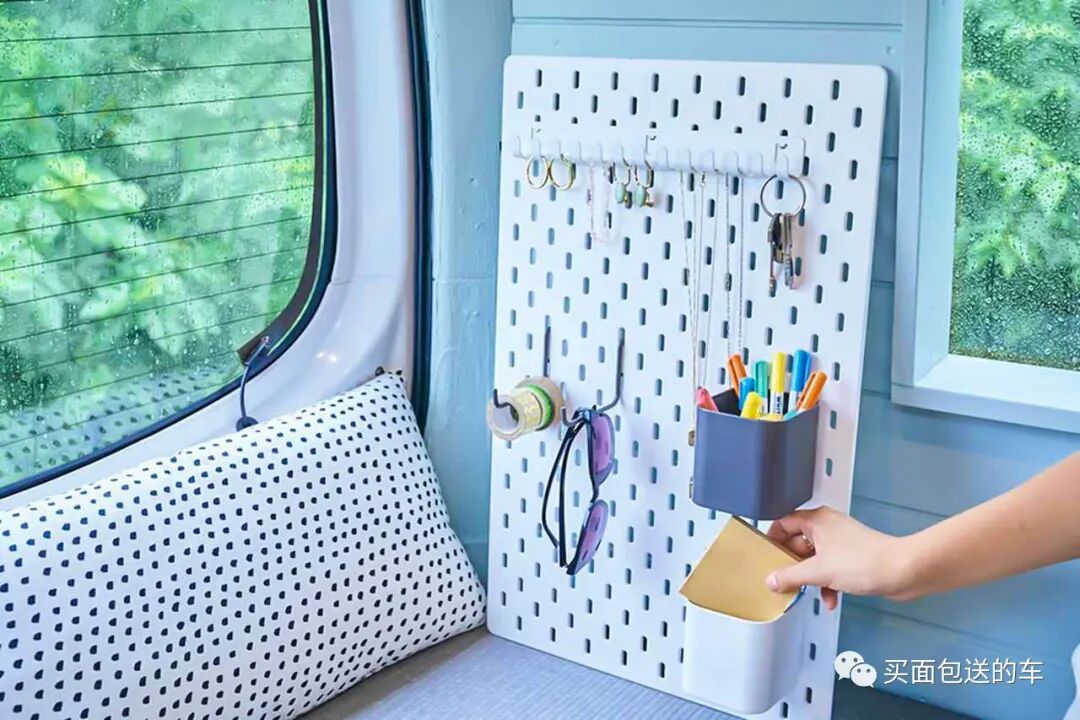 利用宜家的洞洞挂板和篮子存放生活用品,至于洗漱就只能在房车公园进行了。
