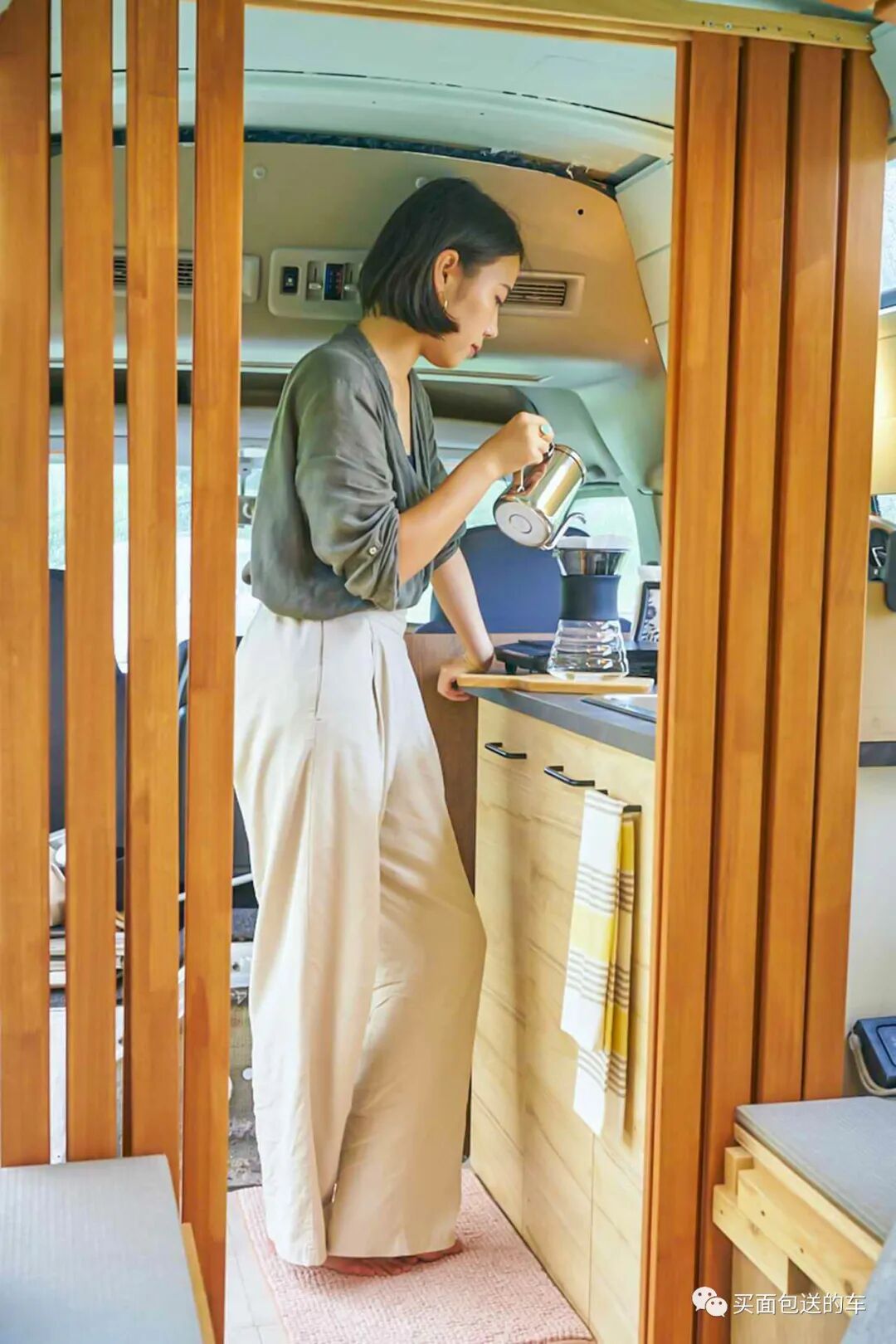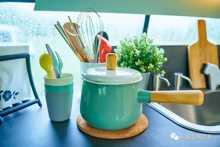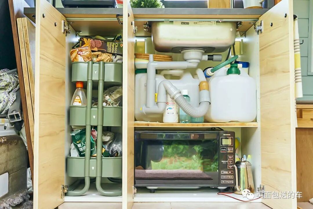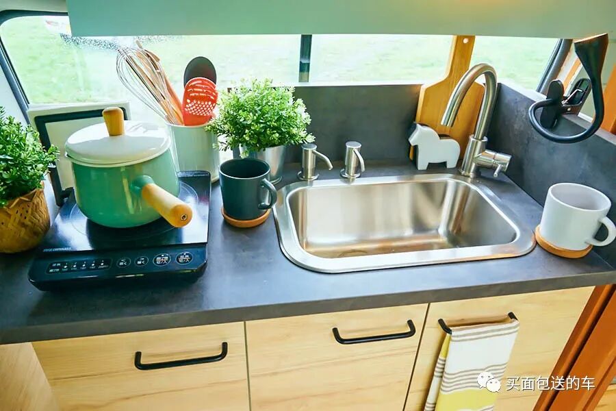 在隔断门的前方,水电集成柜体能在车内实现简易的烹饪处理。