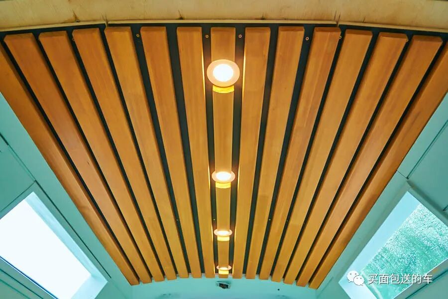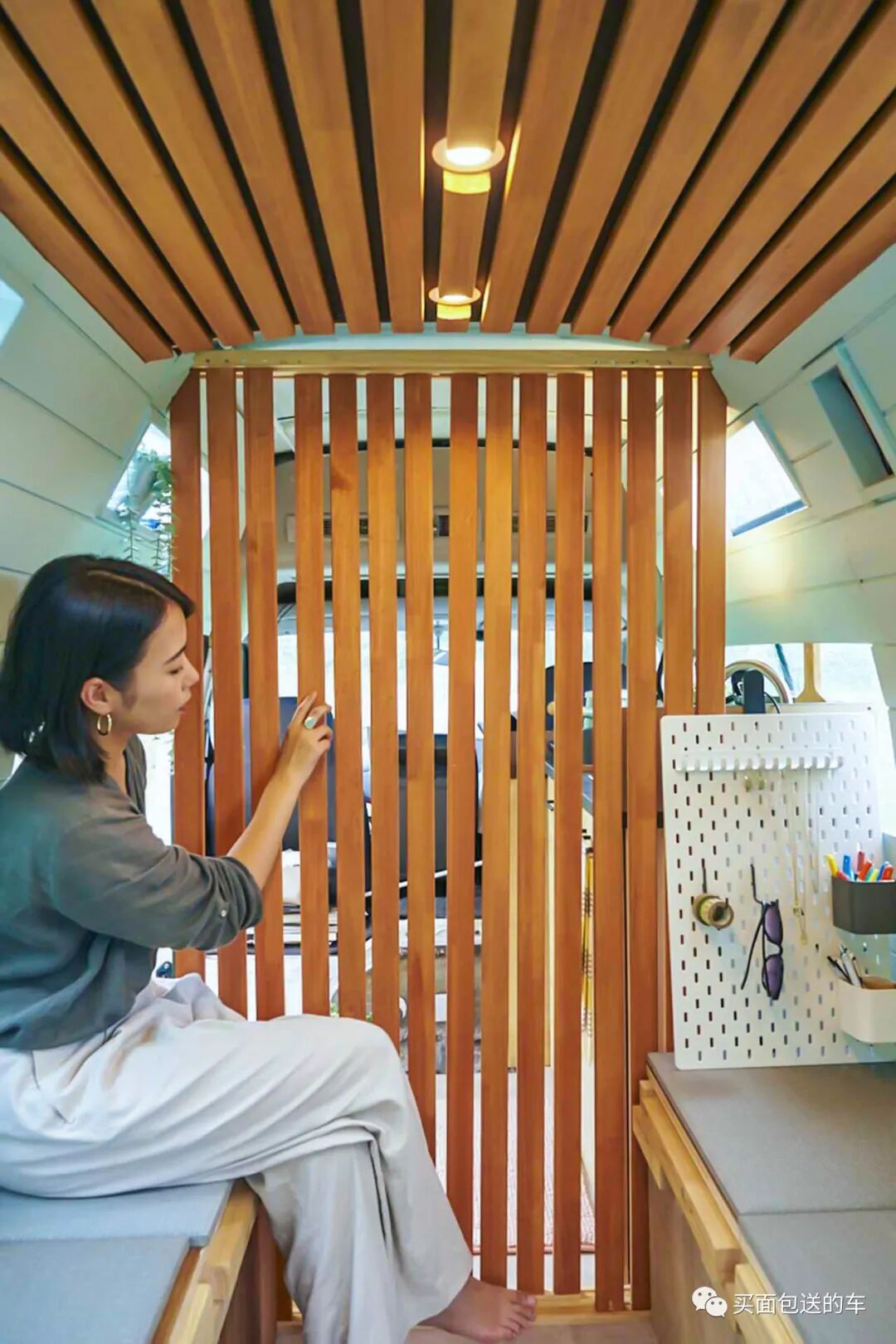 改装方案的特色是在第二排与第三排之间采用木条制作的隔断,将车内分为前方的厨卫和后方的居室。这个木条隔断采用抽拉结构来实现。