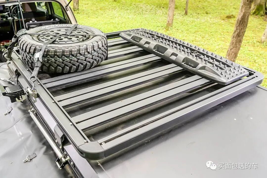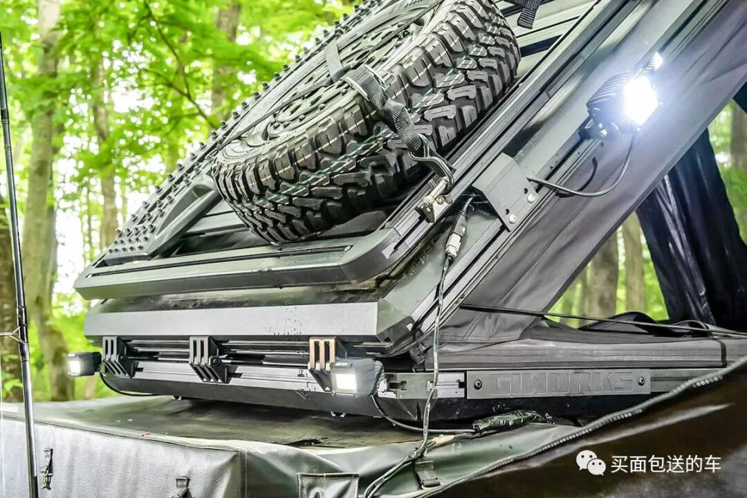 拖车顶部加装的是GI Works的硬顶车顶帐篷,有独立的贝雷架,玩家可以继续在车顶帐篷上方进行拓展,例如备胎和脱困板。