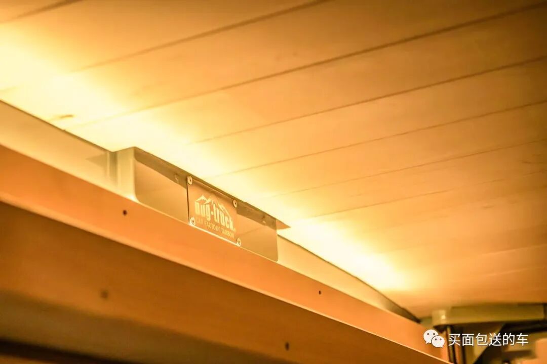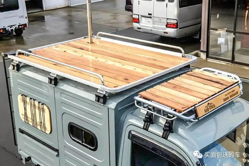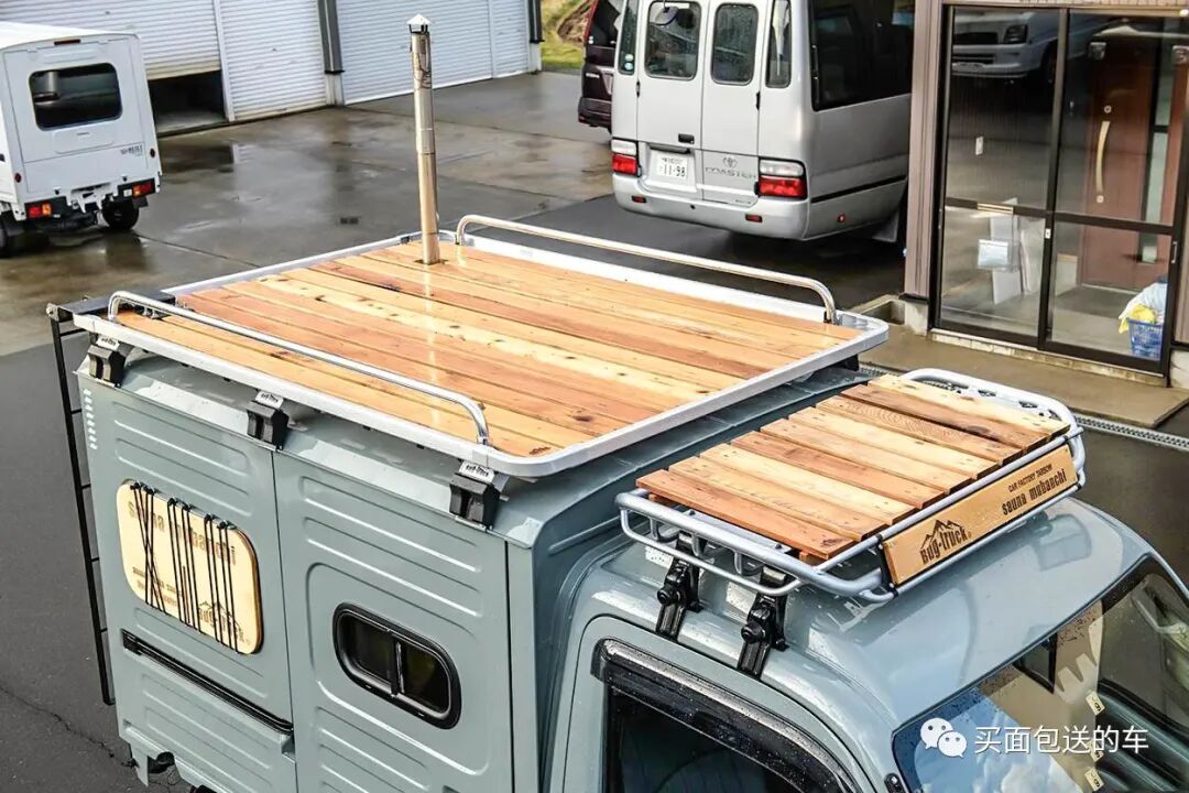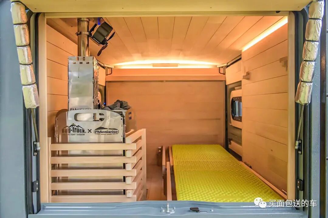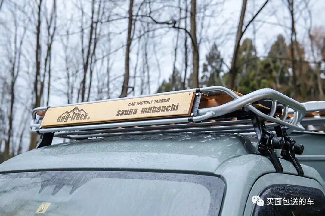 车顶的行李架铺设了全通的桑拿板作为车顶阳台,桑拿结束后可以再来个日光浴。
