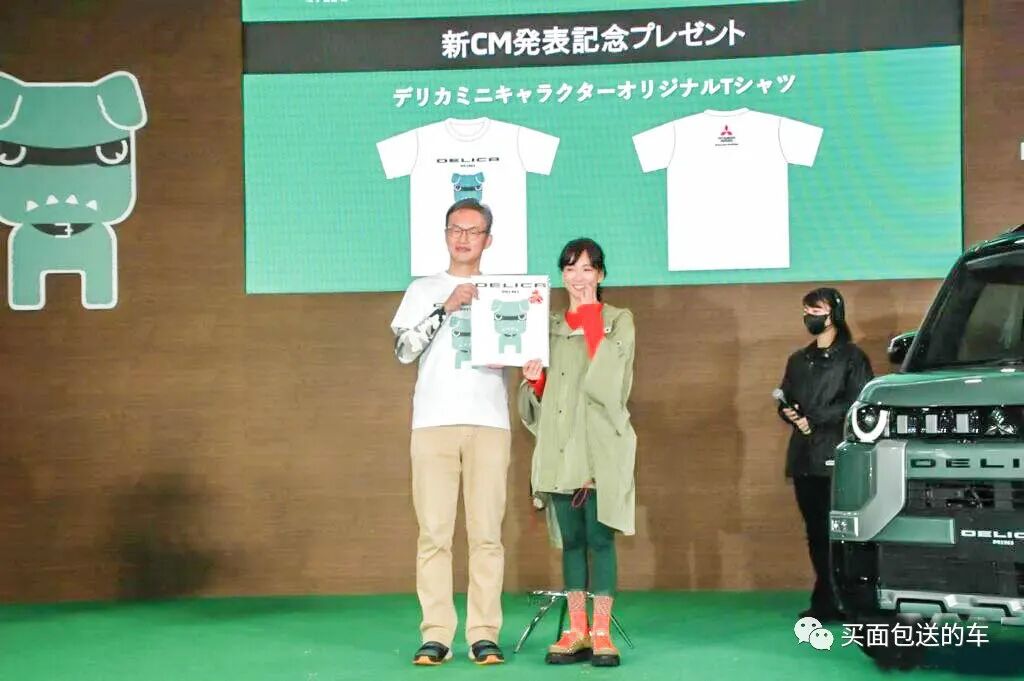 水川麻美在秋岛市的森公园户外村举行活动三菱发布会上,接受三菱执行副总裁 中村达夫 为其定制的T恤周边。