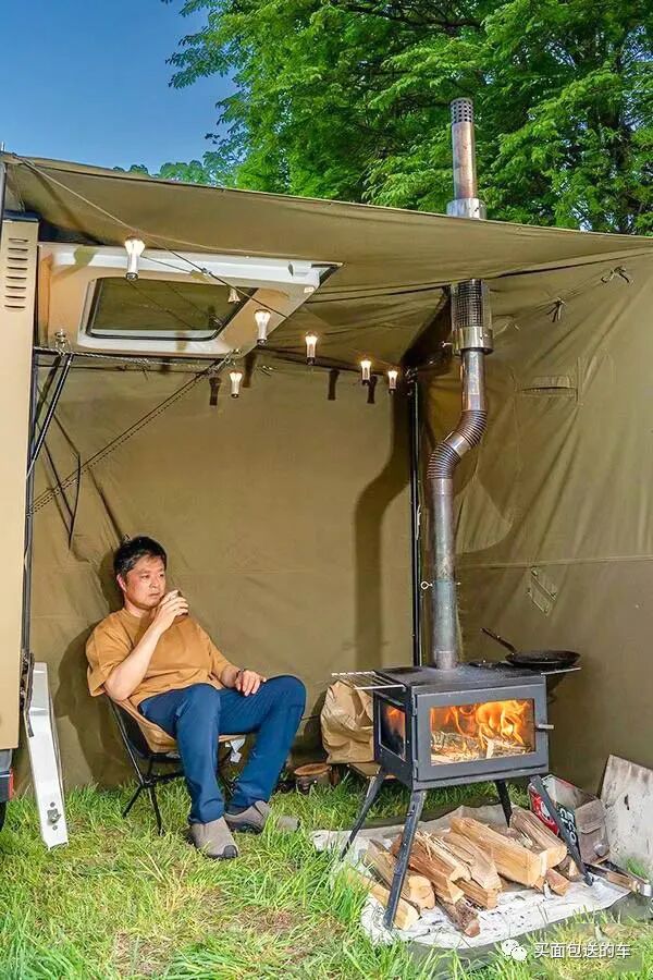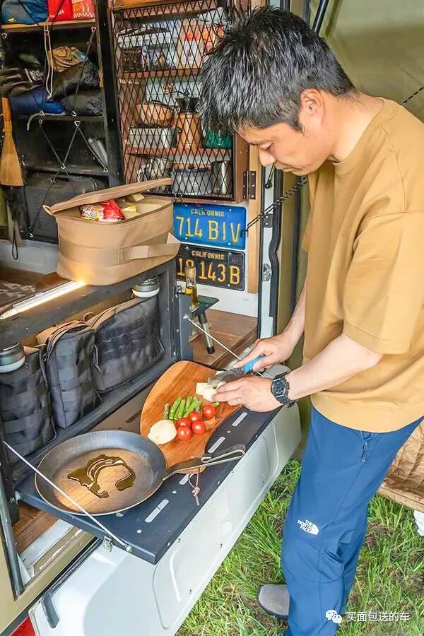 SMALL BASE CAM露营车除了内装饰改装,在尾门后方使用180*180cm的军用防水帐篷,实现了车边帐篷的搭建和空间拓展。