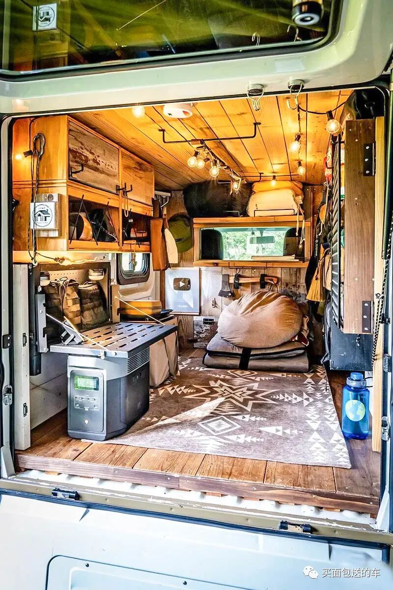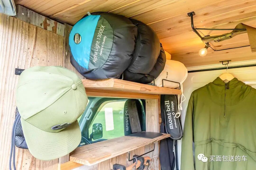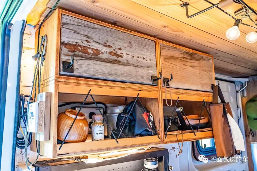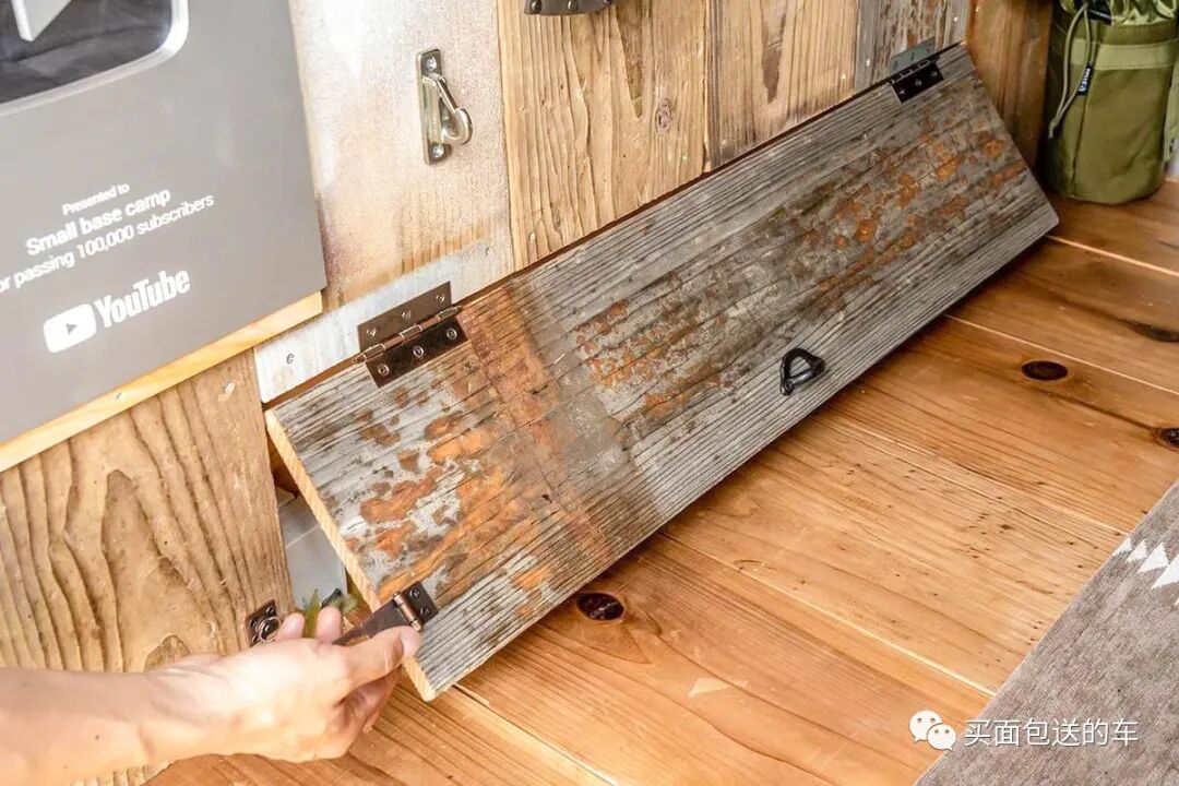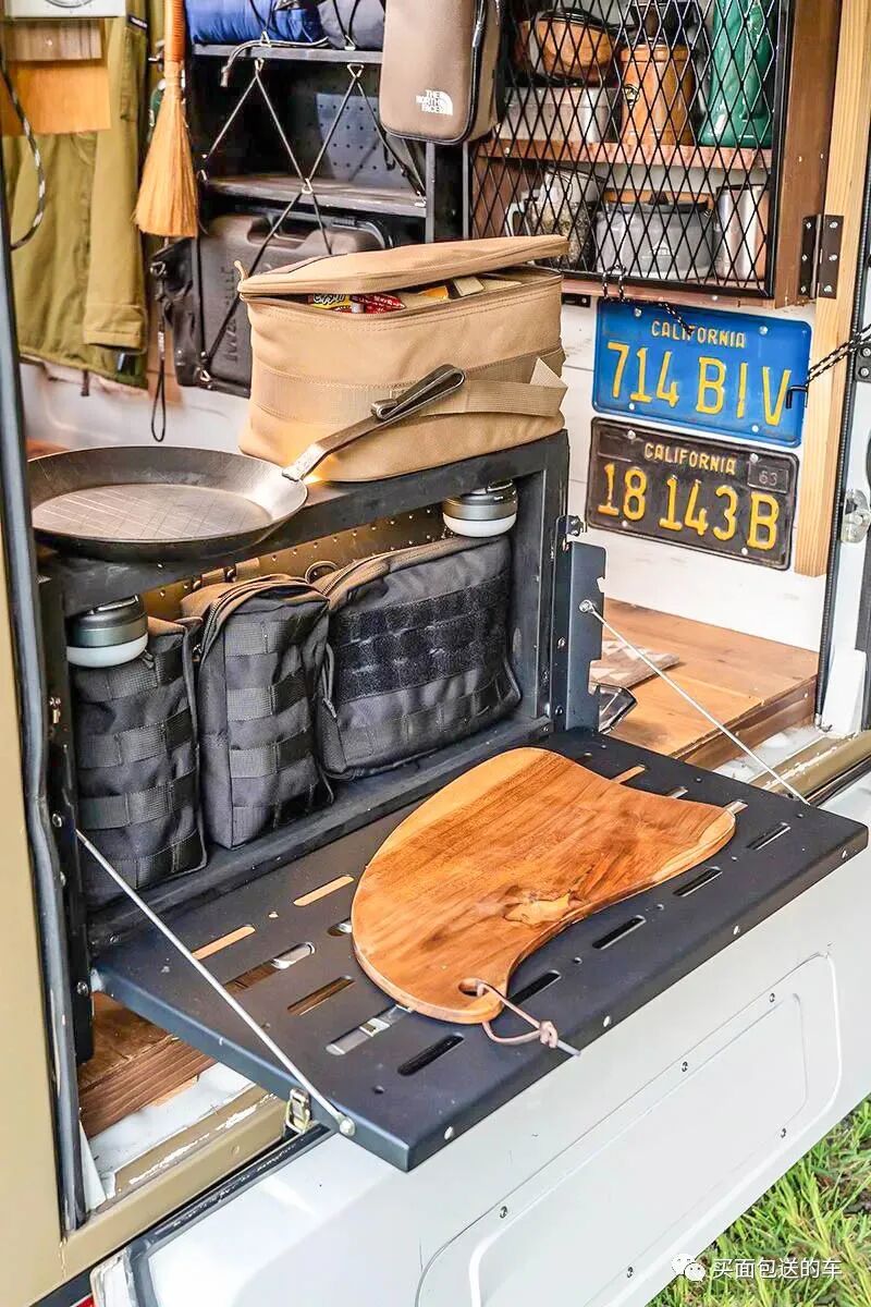 用天然陈化实木板制作的内饰,为了应对岩手县的寒冷气候,在金属和木材之间加入了隔热层,采用移动电源为车内进行供电(注意尾门板上的磁铁挂钩)。