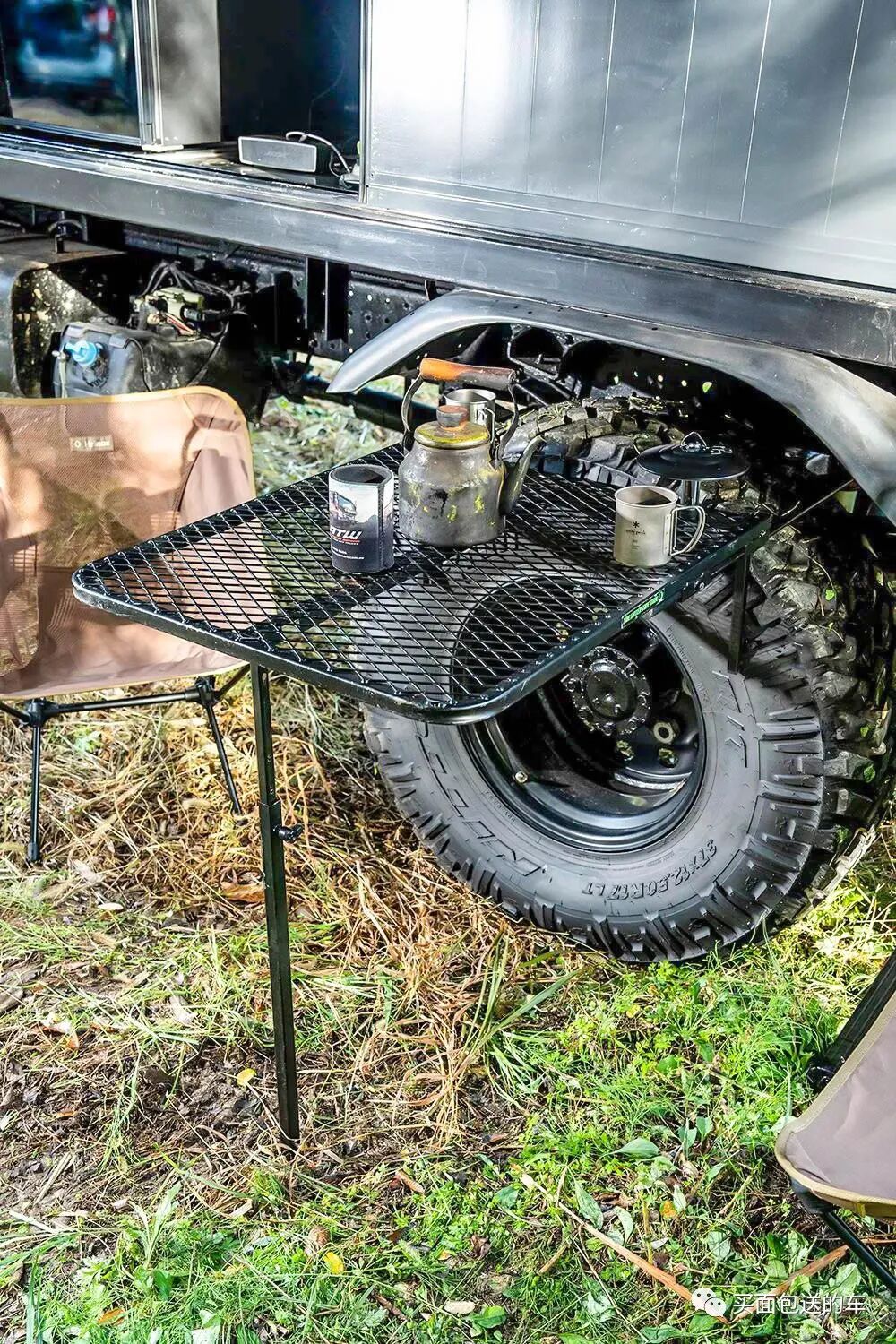 轮毂更换为澳大利亚 ATW (17×9.0J) , 轮胎更换为日东越野的 Grapper (37/12.5R17),在户外还可以用这个简易的桌子恰饭。