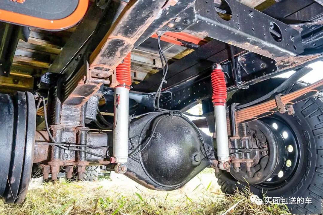三辆车都选择了四驱版本,底盘都做了升高改装以适配复杂的地形,对于FUSO扶桑这样的卡车底盘,升高的方式是很简单,用加长的U型卡在弹簧和车桥之间加入3英寸的垫块即可,为了提高舒适性更换了可调阻尼的赛车减震桶。