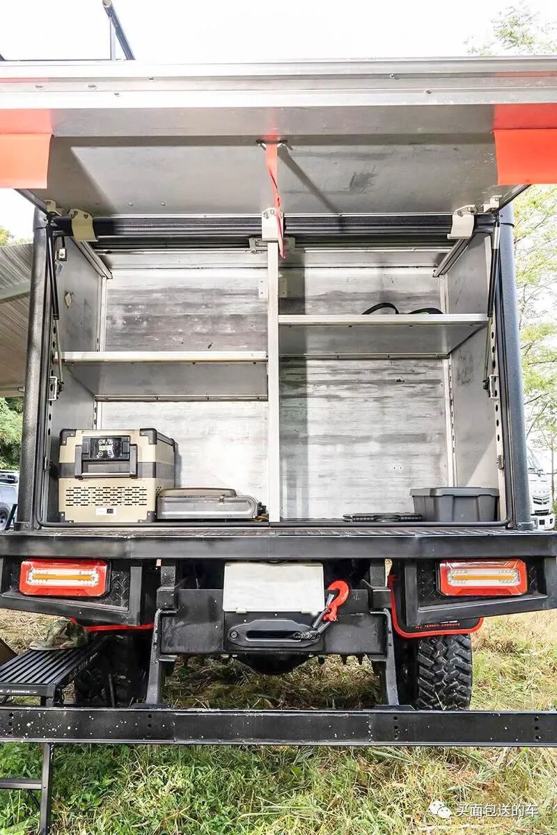 升高底盘并更换越野轮胎后的视觉效果,感觉车子变大了,其实这依然是一辆和五菱荣光新卡差不多尺寸的小卡车而已。HITORI先生用物流车货箱改装的尾箱,用来托运户外装备,注意这个宽度为3.5米的侧边帐篷。