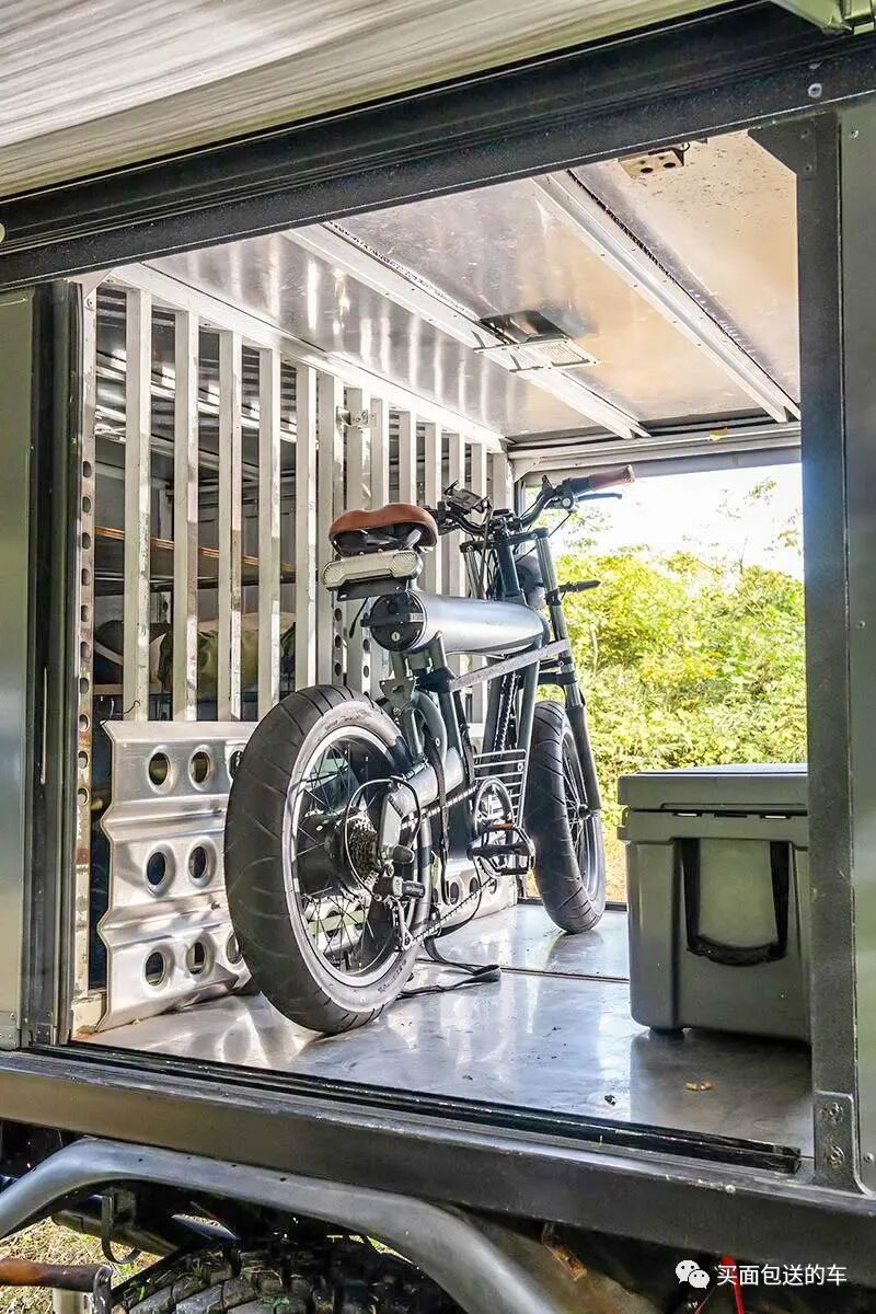 推拉车门的每个隔间都对应安放户外装备,比如电动单车和户外冰箱。