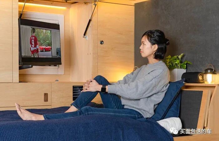展开的床位结构尺寸与布局都和正常家具无异,加上带万向节支架的显示器,实现双人卧室的体验 。