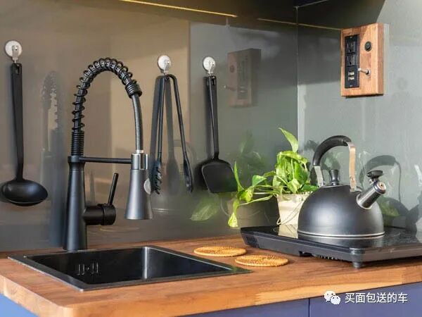 厨房吧台采用精致的美式胡桃木制作,并使用标准的家用五金厨卫件,配备家用电磁炉和可伸缩的花洒龙头。