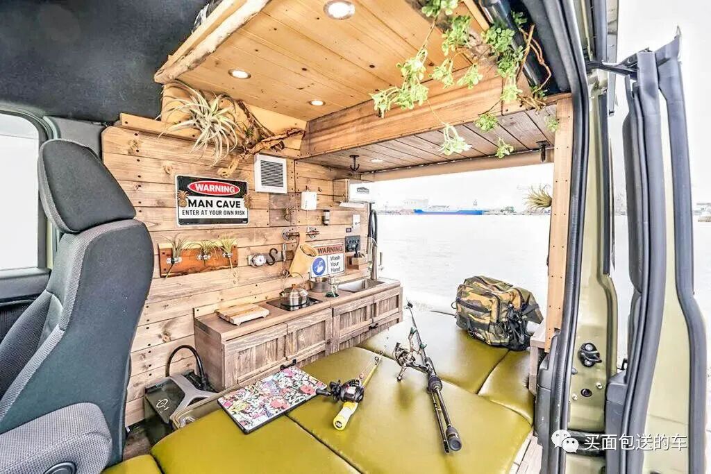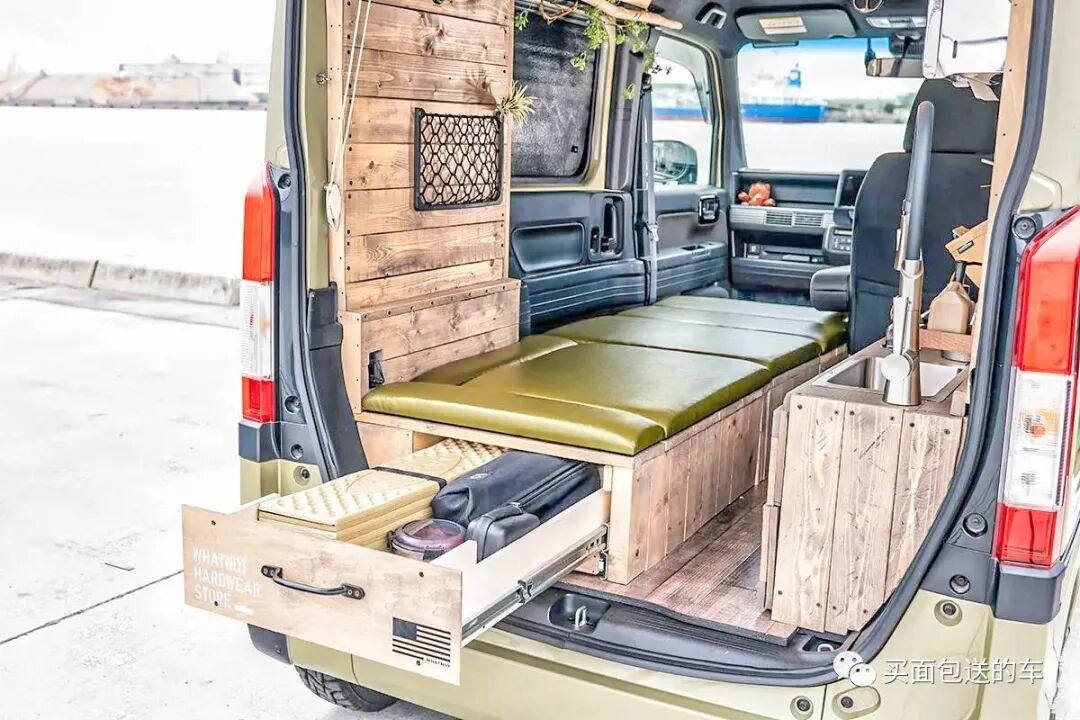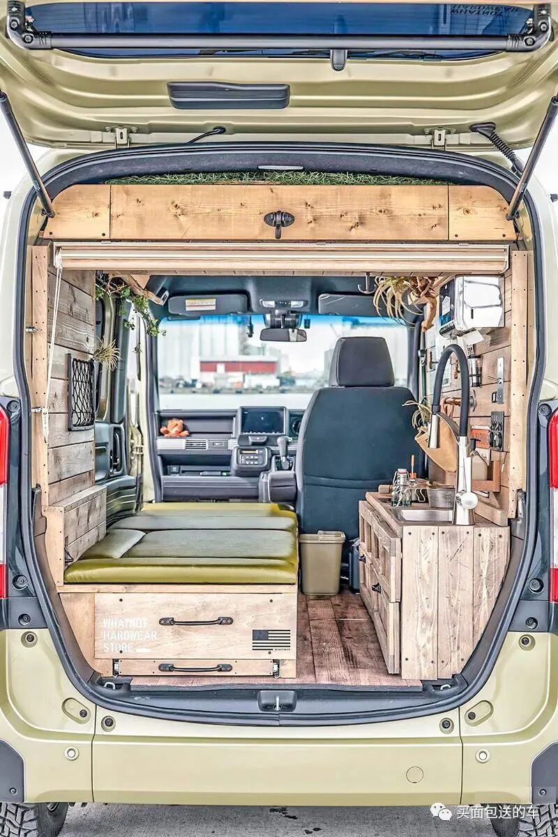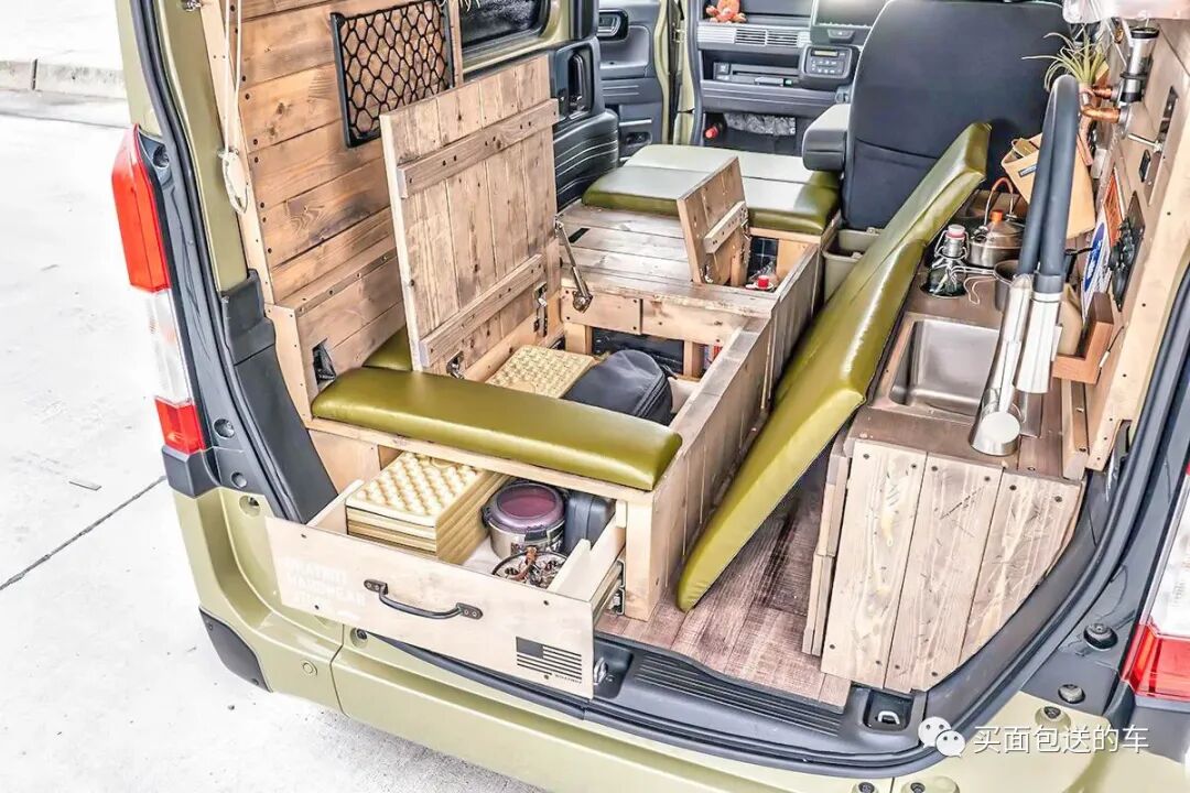 本田N-VAN轻自动车具有无B柱车身设计的空间优势,兵库县的玩家 直也先生只改装了原车的轮毂和轮胎,特色 直也先生动手为其打造的复古内饰,满足了钓鱼装备的携行和 车中泊的需要。