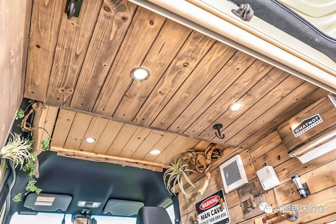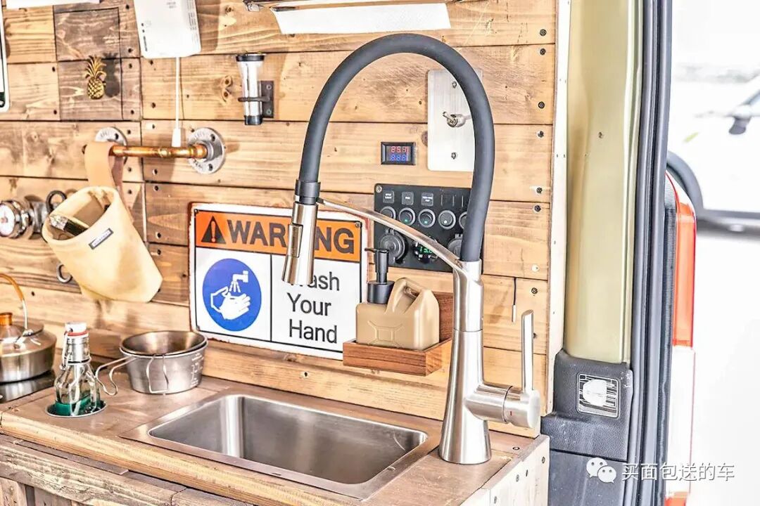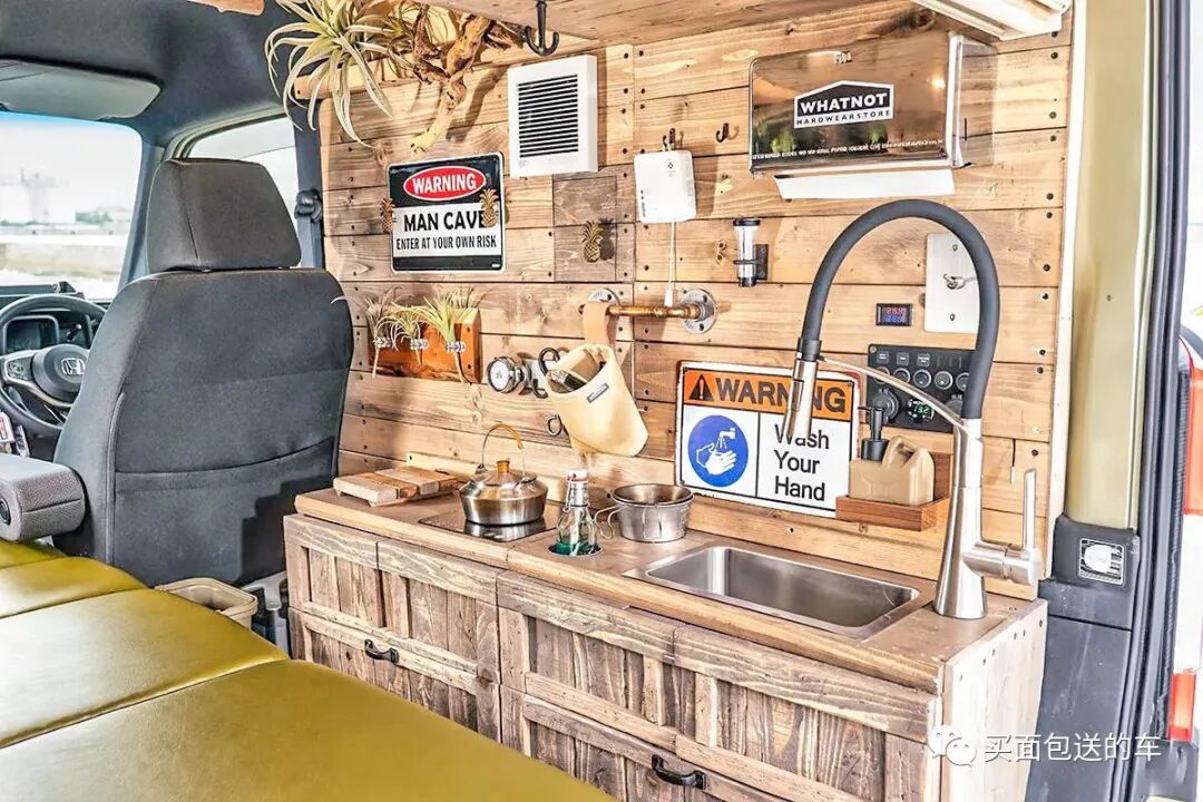 在后排用天然陈化木制作的内饰,覆盖了主驾驶后方的空间,包括功能全备的炉台和水台,并充分利用侧壁安装了电器控制开关和12V取电插座,而这一切都是玩家 直也先生手动打造的。