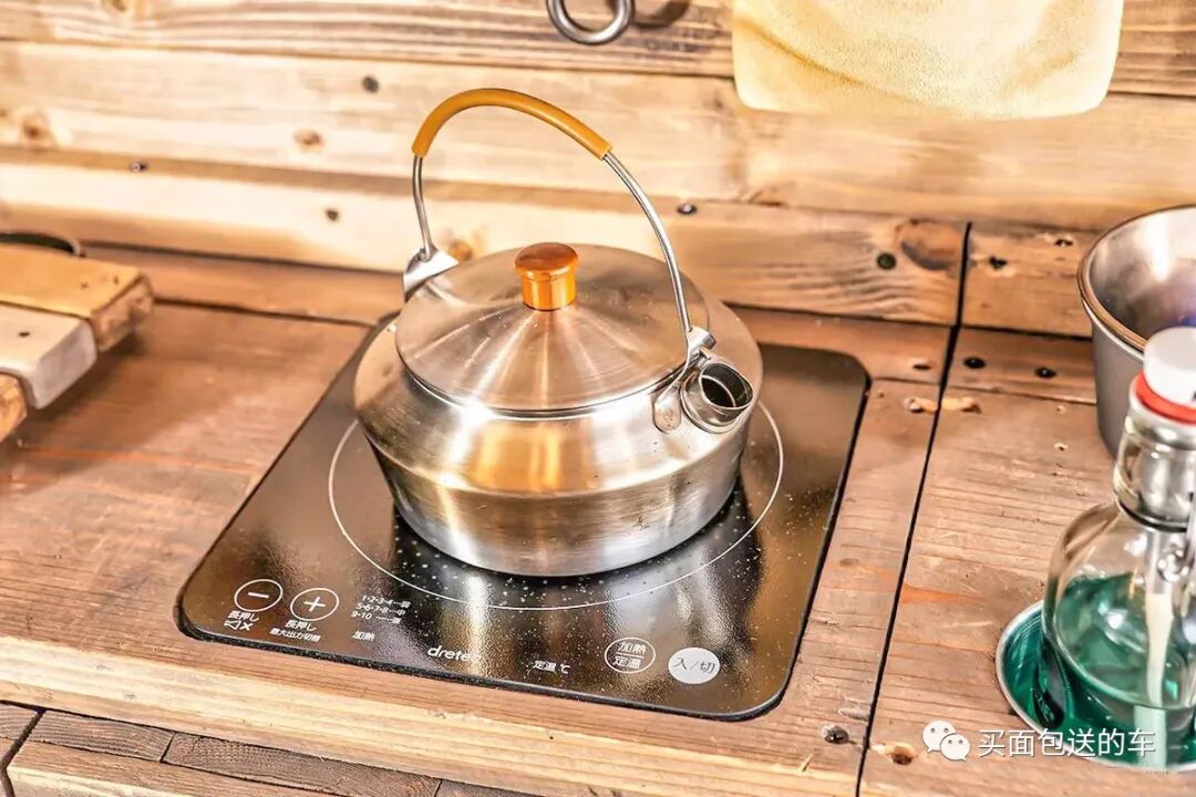 小尺寸的电磁加热炉,嵌入在桌板内方便加热饮料和食材。