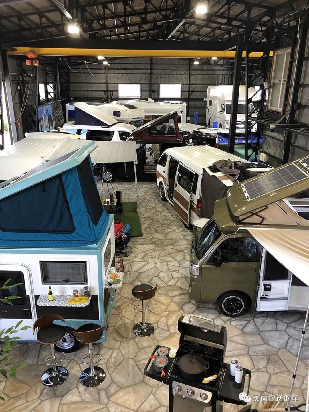 在"Direct Cars”的展厅内,所有可供出租的露营车一字排开,并且店内布局都还原了户外场景。