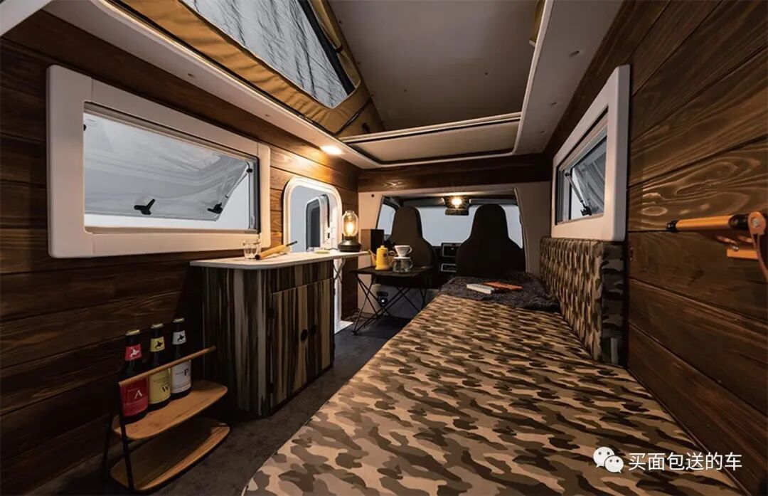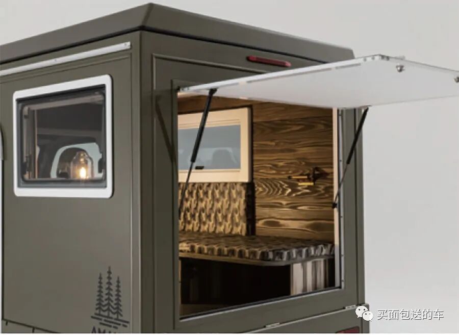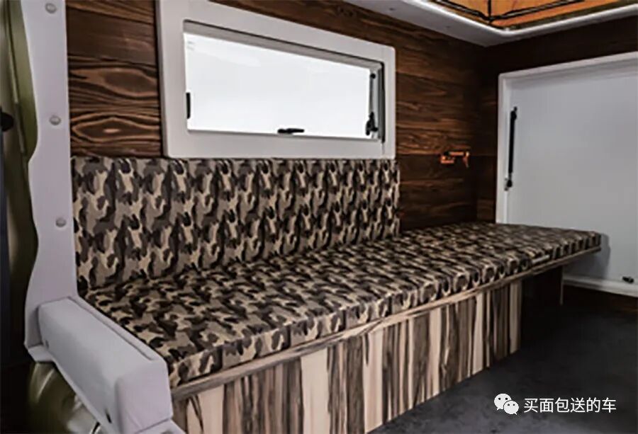 作为出商用租用的车辆,车内没有繁复的软装饰,只提供基本的折叠家具,折叠家具采用户外防水布套,方便出租后打理车内卫生。